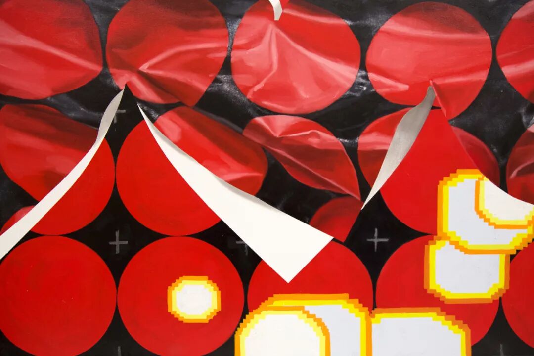 我准备工作的第一步是“绘画模型”,即在打上底料的纸本上绘制草图,有时也会借胶带去成形一些3D细节。基本框架完成后,再将“模型”移至画布上,在这里,我与画面有更多自然或偶然的切磋与琢磨生发。展览中的《地格》即是从这一过程中生成。红色圆圈的使用和两个褶皱的图形是“绘画模型”的构思,其它元素与笔触,如画面中爆炸式的泡泡,便是事后决定。艺术家与作品之间的对话、摩擦、协商是在创作中发生的,这很重要。我不希望完整的草稿构图限制这一过程。