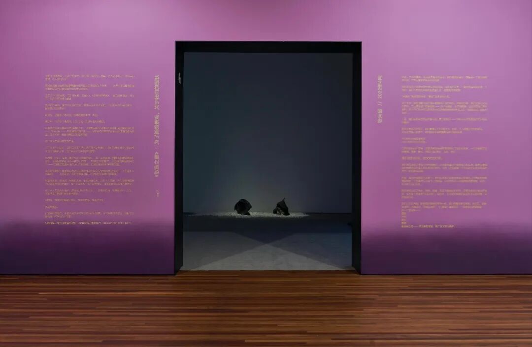 展厅墙面之所以使用渐变的渲染色,是希望呼应一种蜕变感,与《宣言》里的思维转变和《宣言》的本质(一件持续演变的写作作品)相互衬托。选择颜色的过程很有意思,漆色名称都很有趣,我最后选用的是“雨中起舞”和“紫色丝绒”。布展的决定是逐渐形成的,一个决定推动另外一个决定,就像我的创作过程。