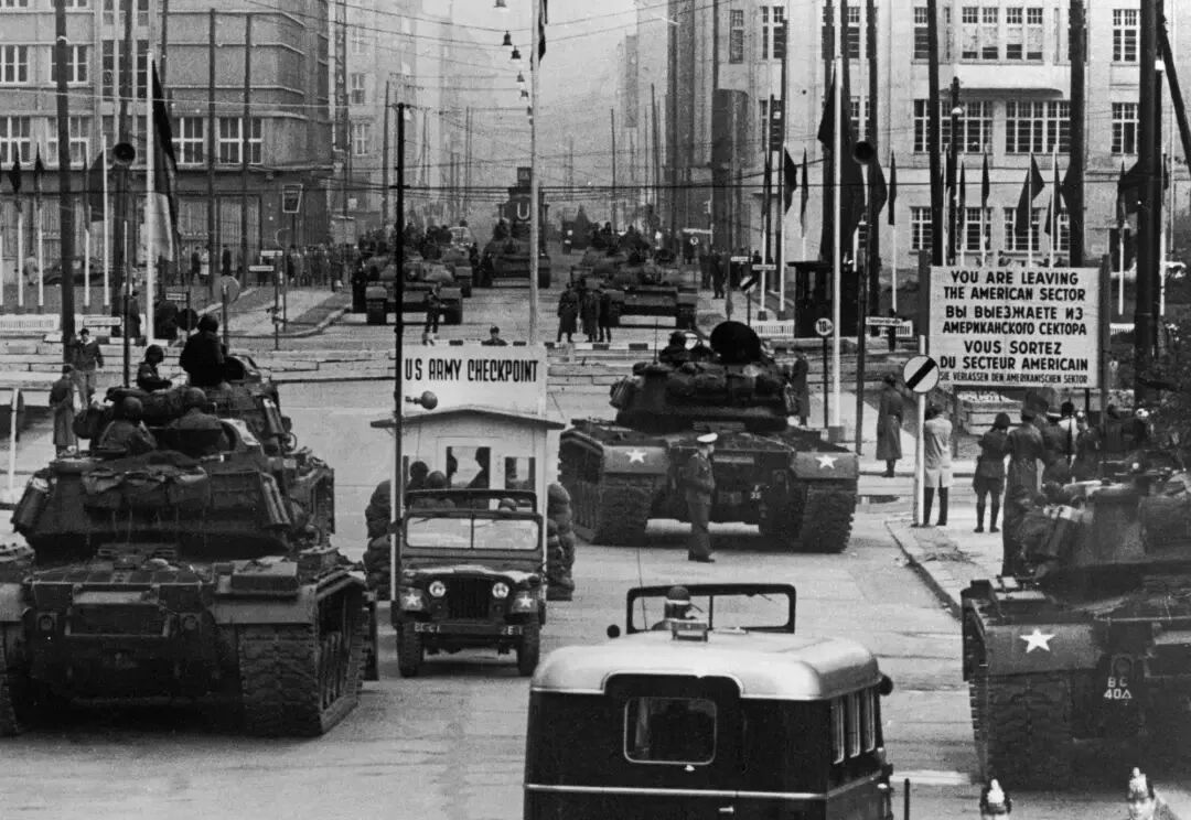 柏林墙开始建造时,美国和苏联军队互相对峙的照片。