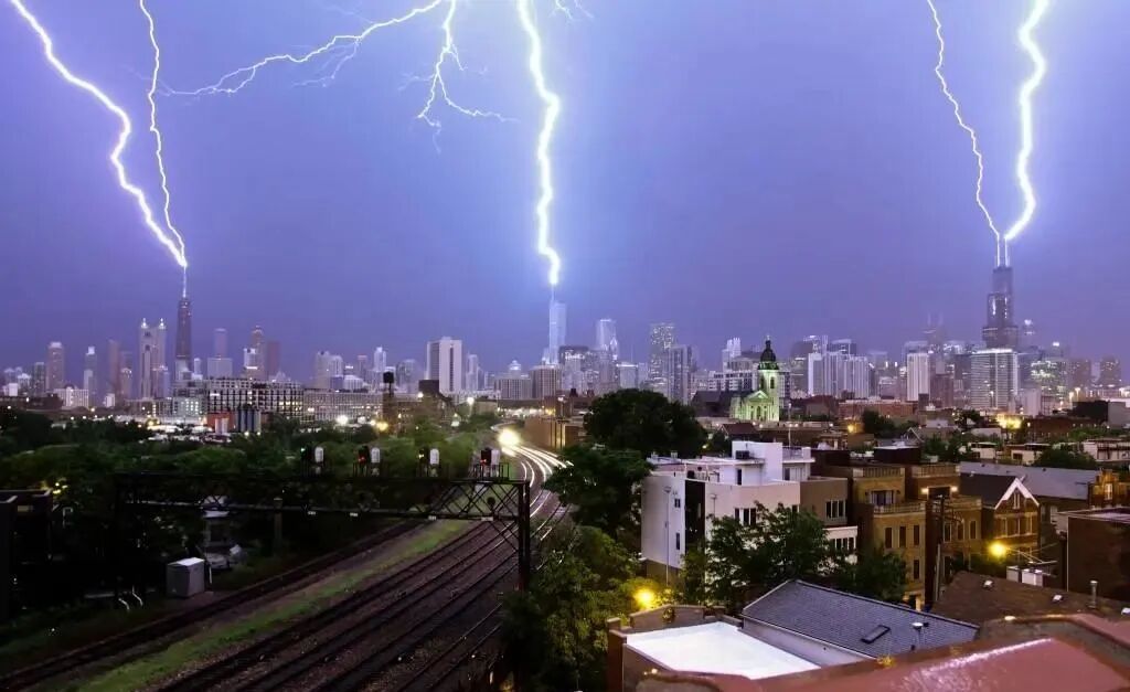 三道闪电同时击中建筑物的照片