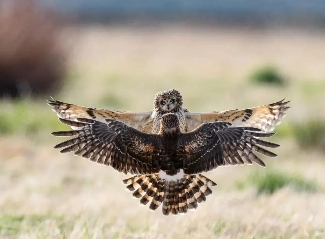 一只短耳猫头鹰与北方鹞作战。