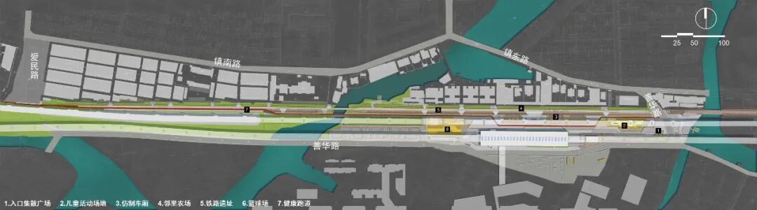 项目位于宁波市鄞州区五乡镇,西起爱民路,东靠后塘河,南至善华路,场地沿线毗邻萧甬铁路北仑支线地面废弃段、轨道1号线和萧甬铁路高架段,全长约 987 米,腹地宽度约 8—52 米,是宁波少有的废弃铁路改造项目。