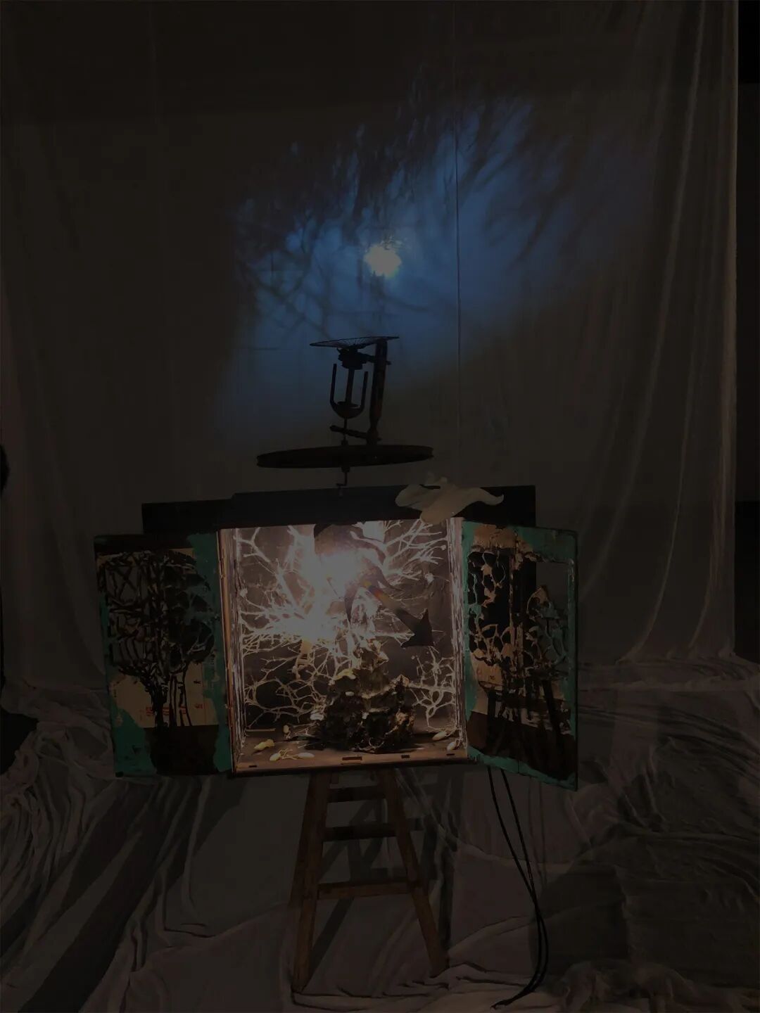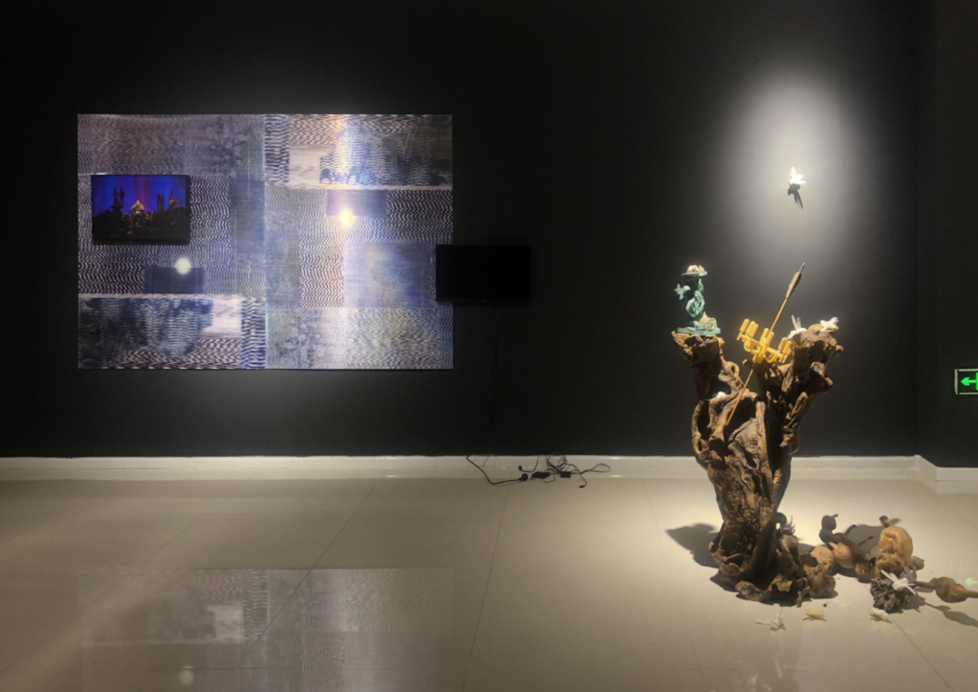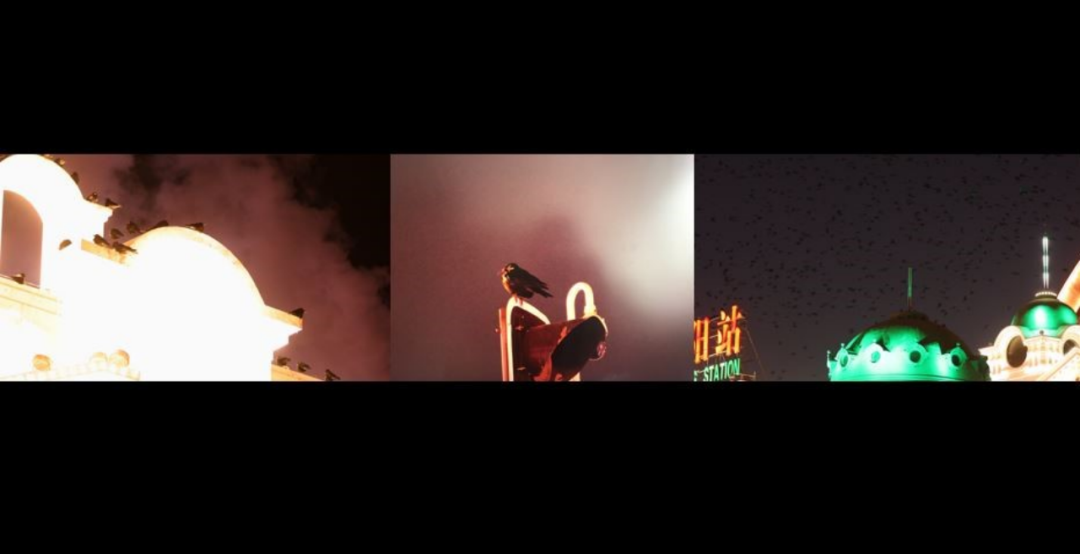 作品通过跟踪乌鸦群落的息栖地,觅食、占领地区,乌鸦具有的群居和侵略性特点,从大庆到沈阳,暗于东北殖民历史,以多层复杂的历史建筑、磕头机等符号结合灯光交织着对历史的反思、祈祷与不安。