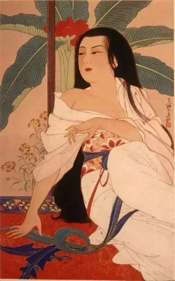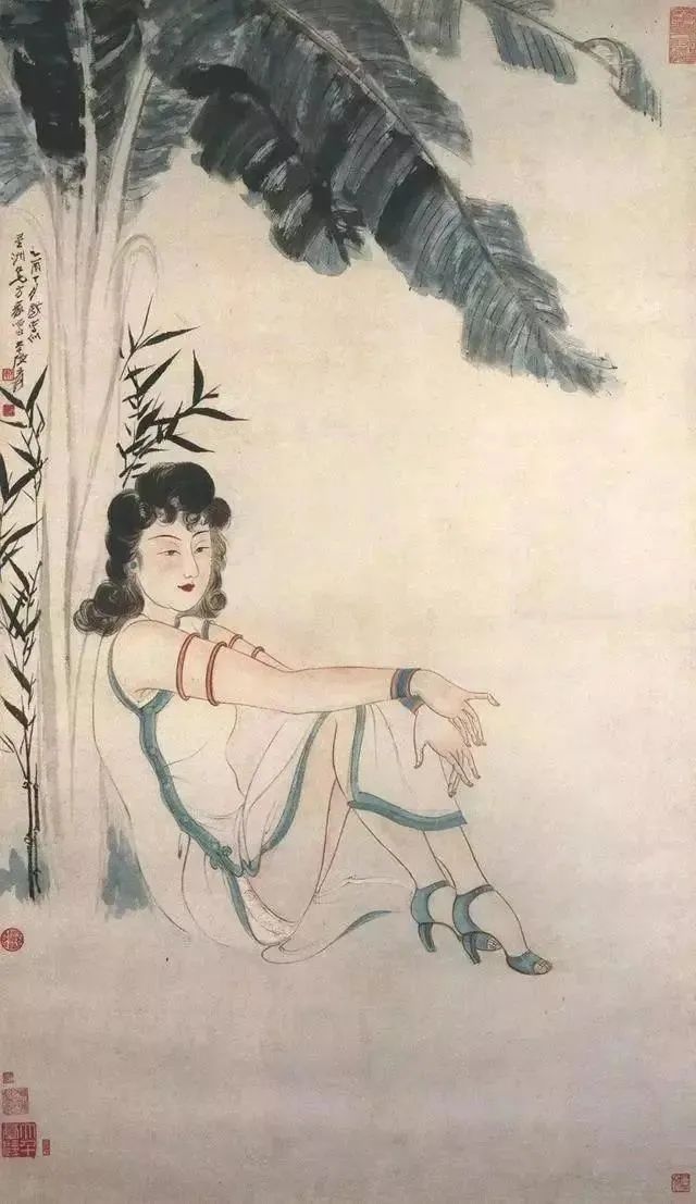 但大千在此改用了优雅的白描线条,及色彩不那么浓艳的浅绛设色,再搭配常见于传统文人画中的芭蕉及墨竹题材,遂使这位现代装扮的仕女一改冶艳风格,充满了古典之美。