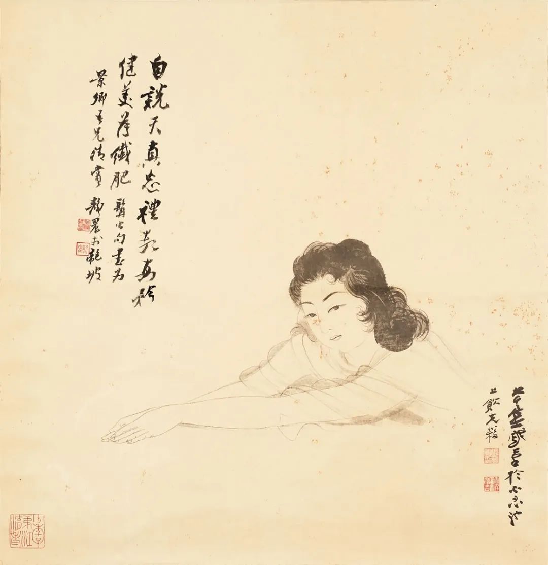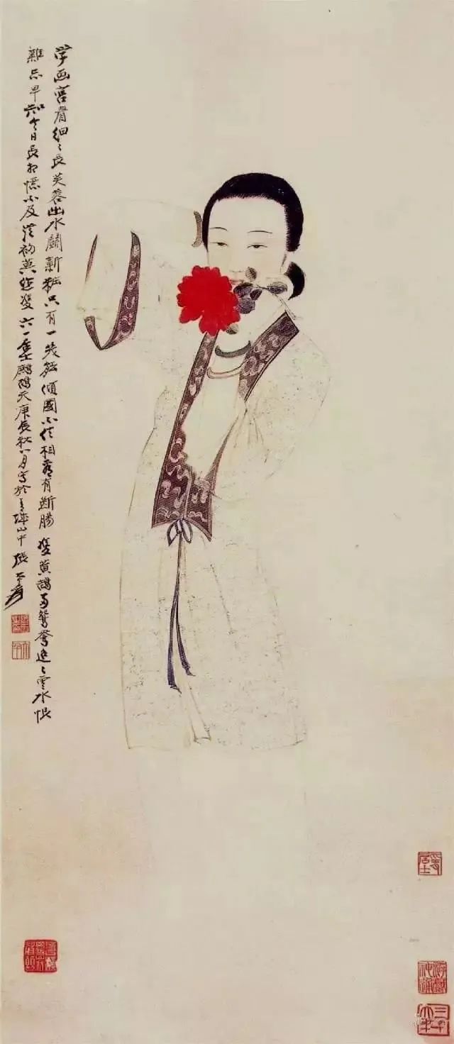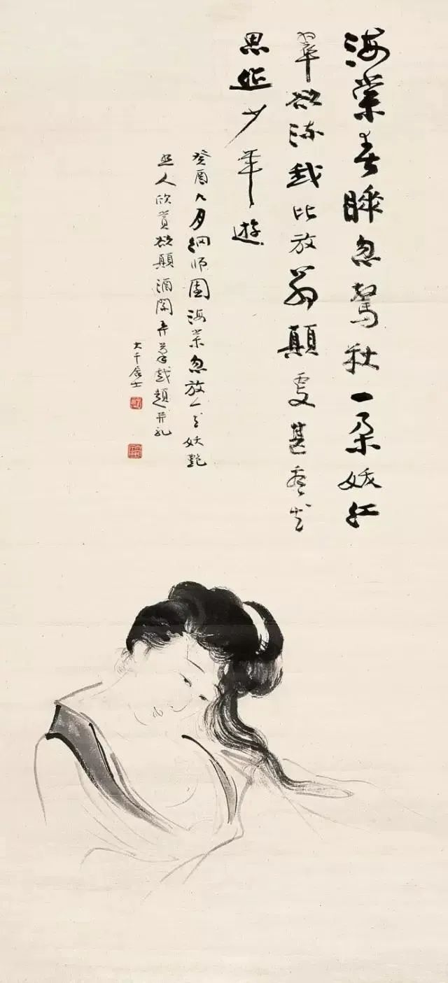 有张大千题诗云:“长眉画后尚惺忪,红豆江南酒面浓。别有闲情怪周昉,不将春色秘屏风。”