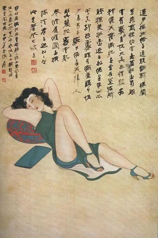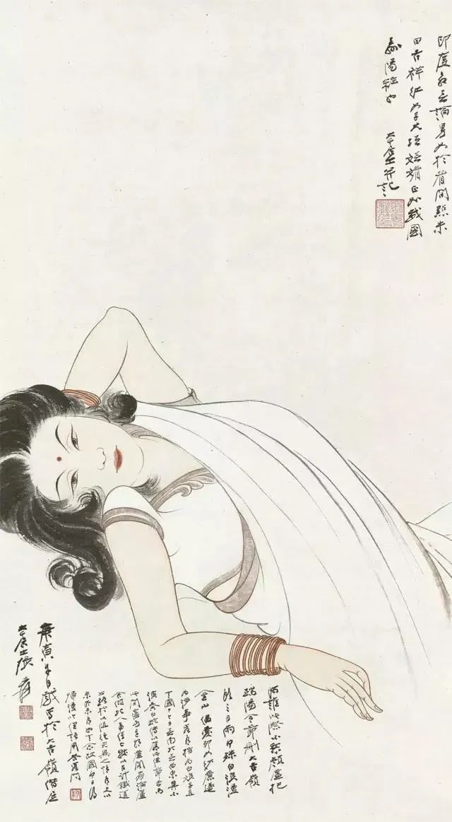 张大千在黄君璧和一群酒友的怂恿下,挥毫创作了《摩登仕女》,将阿环娇慵困倦、玉腿藕臂的形象画了下来,堪称其美人画中的“限制级”作品。