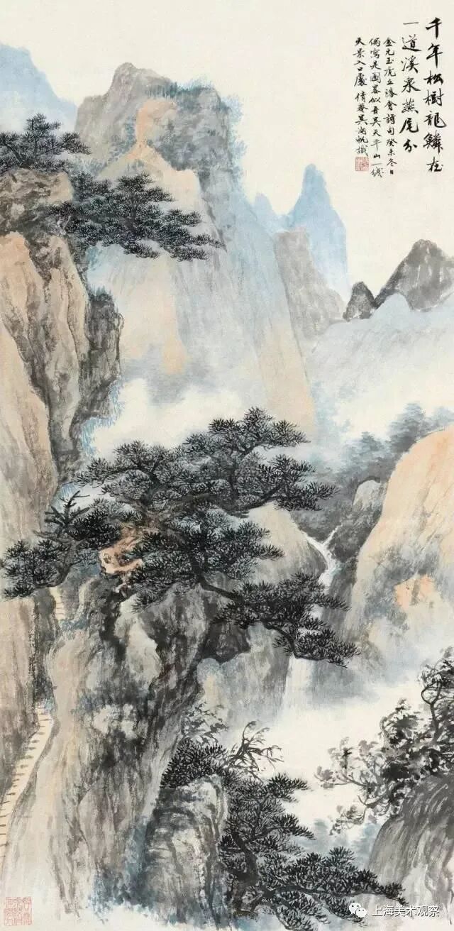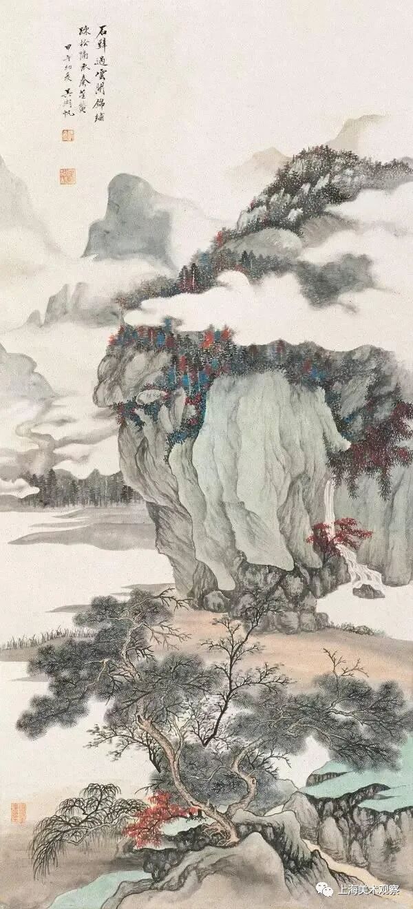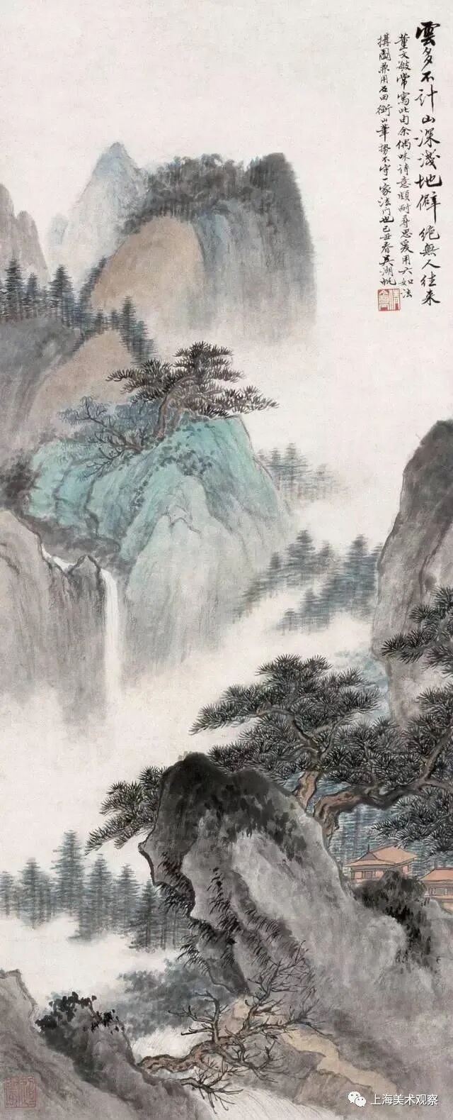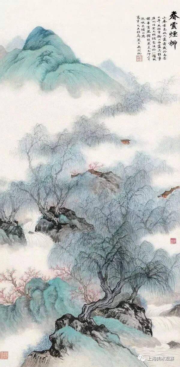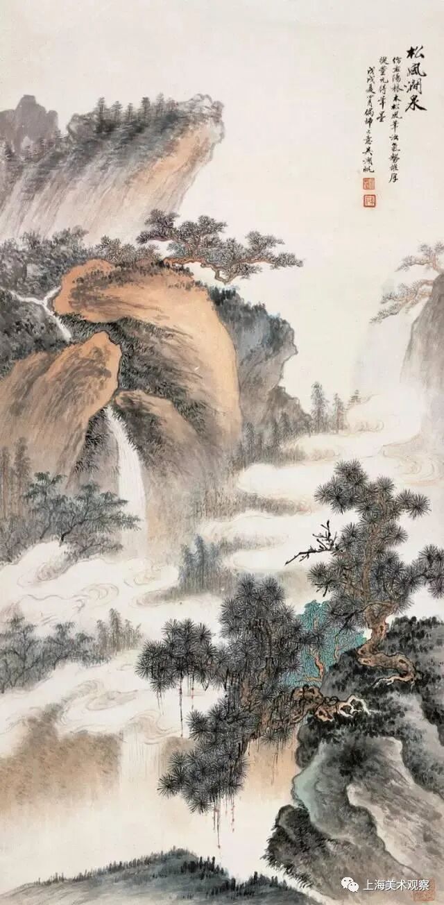 他擅画山水,亦擅绘花卉,兼工书法。其山水以雅腴灵秀、缜丽清逸的复合画风独树一帜,尤以融水墨烘染与青绿设色于一体并多烟云者最具代表性。张大千曾将他誉为“民国画坛第一人”。