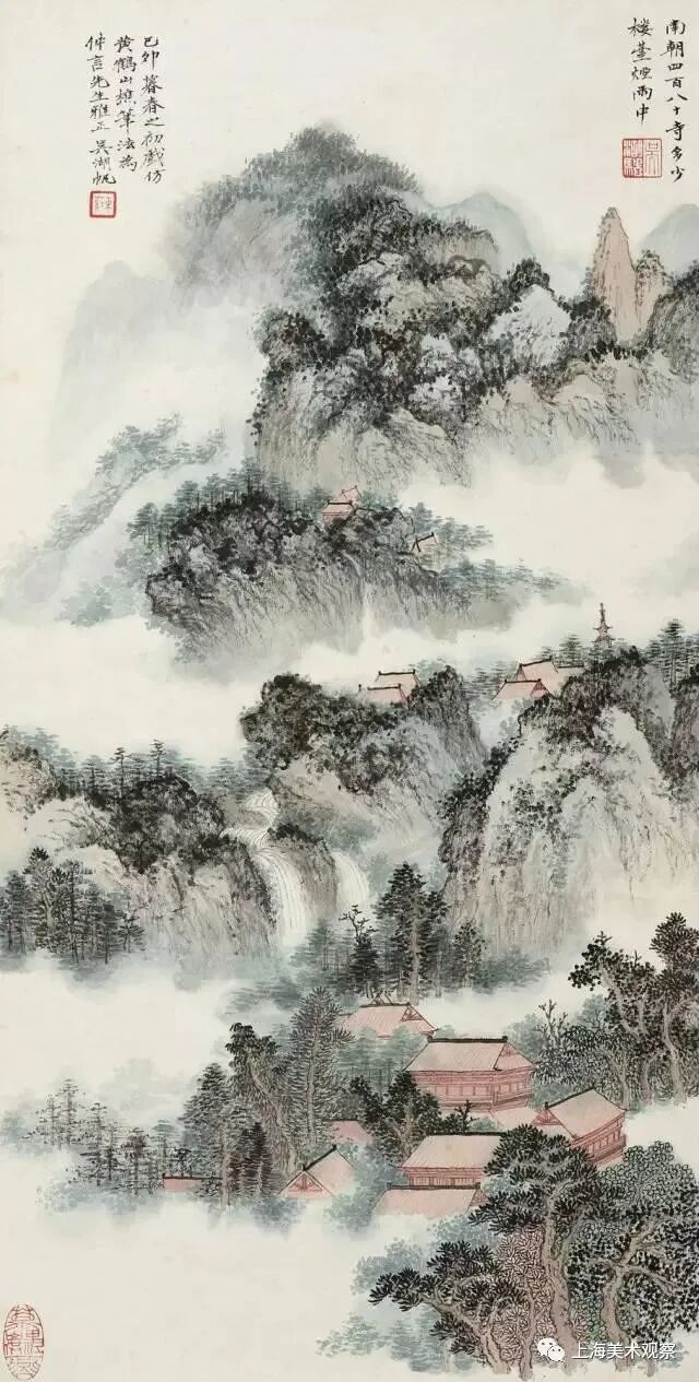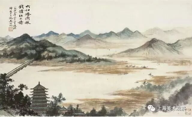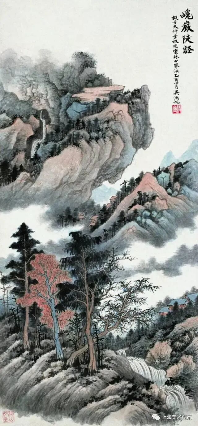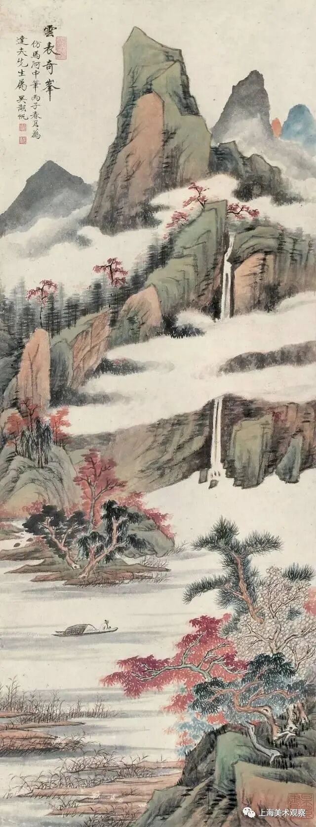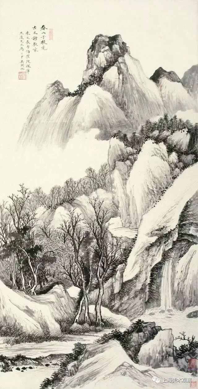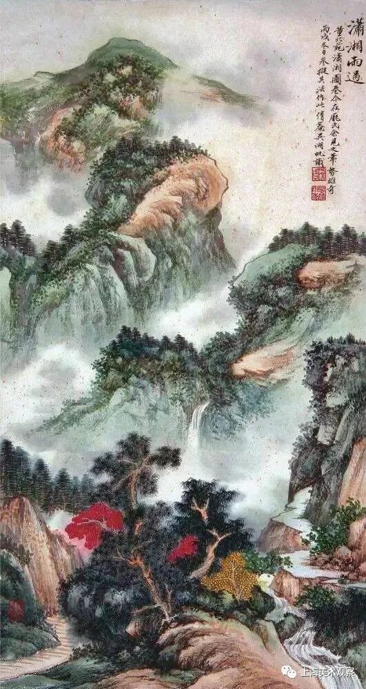 他擅画山水,亦擅绘花卉,兼工书法。其山水以雅腴灵秀、缜丽清逸的复合画风独树一帜,尤以融水墨烘染与青绿设色于一体并多烟云者最具代表性。张大千曾将他誉为“民国画坛第一人”。