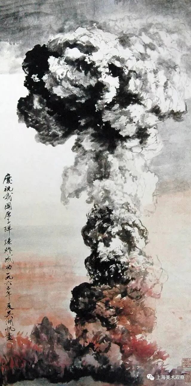 吴湖帆 原子弹放射图。1964年,我国试放第一颗原子弹,吴湖帆看了几次记录片,又看到彩色照片,就用平时点染烟蟑妙笔,绘成《原子弹放射图》,在画展上展出时,解放军在意见簿上提出要求:“请把这幅画制版,印为宣传品,以供群众购赏”。