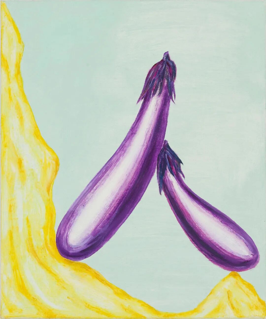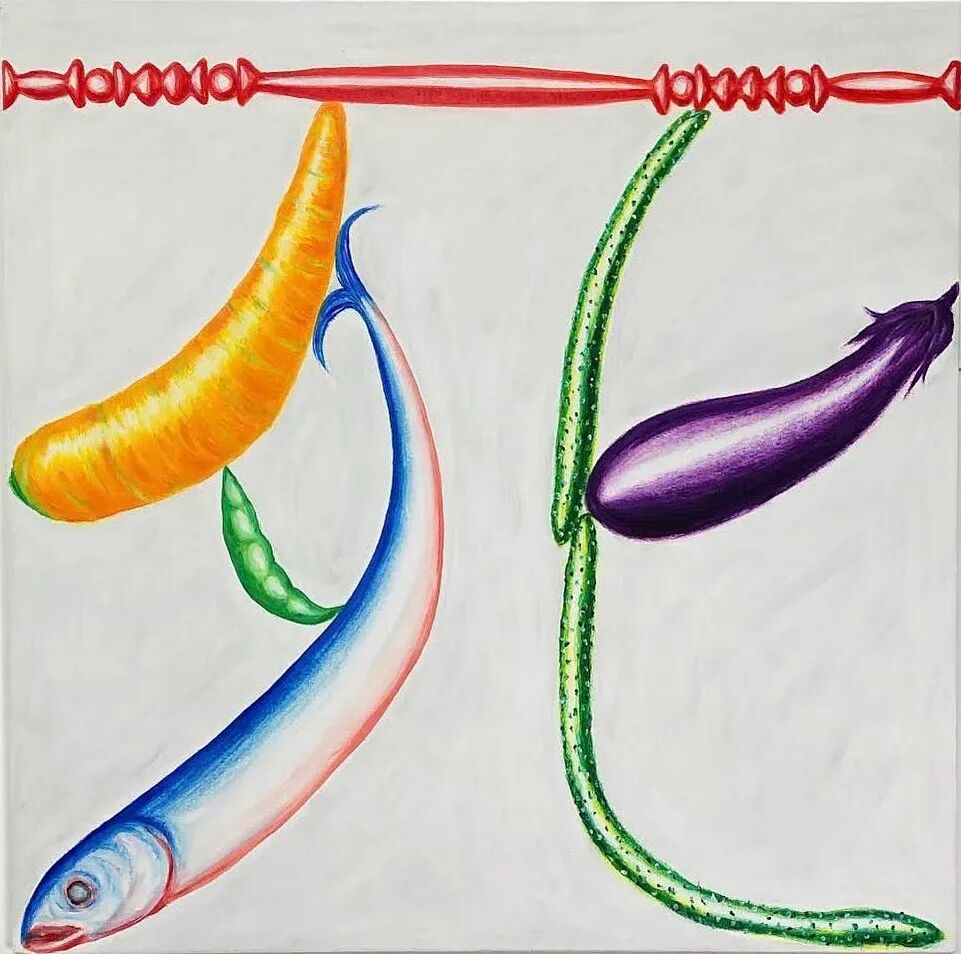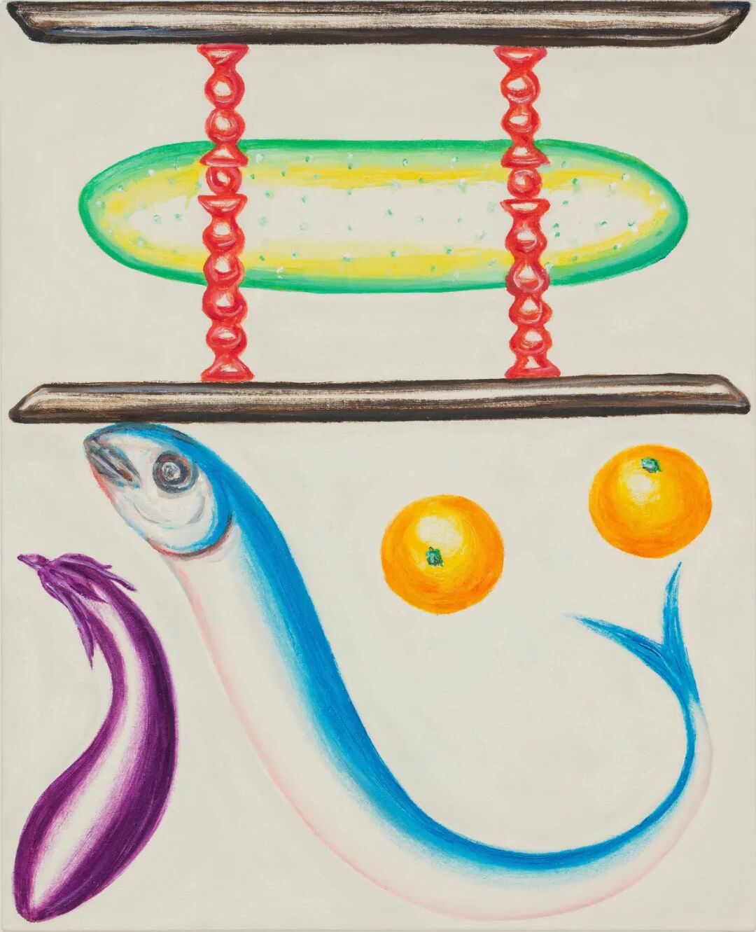 画家受日本浮世绘、漫画和各种西方绘画传统的影响,作品以反复出现的水果、蔬菜、鱼为特色。他对堆叠和图案中物体的编排呈现出一种临时的、生动的外观,就好像它们可以随意散开或重新排列一样。