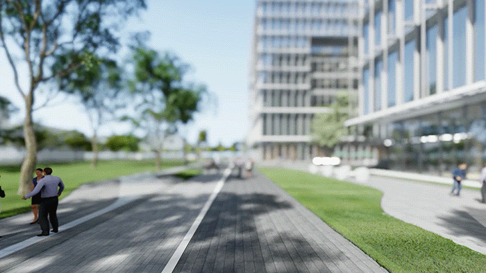 在园区内部环境营造上,中央活力广场贯通园区地块,连接城市绿色道路; 健身步道串联园区各个健康功能节点,结合广场、庭院、私密花园等场所展开多样有趣的室外活动项目。开放式的空间设计既强化从园区与城市的联动性,又打开了景观视野,保留了足够的自然光线与室外风景,让产业园区更具人文关怀。