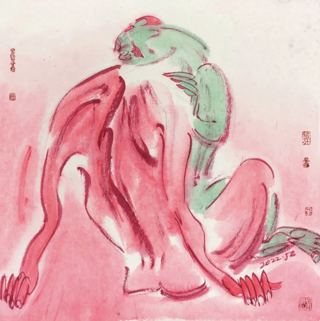 “躺平一族”系列作品的产生,正是因于这种现实与理想、观察与体验往复之中的结果。谈及创作这个系列作品的动机,张江舟说,只是以此记录一下当下的心境,也是为了调整一下生活的姿态。记录心境应该是张江舟一贯秉持的创作主张,更是其一贯的为艺态度。从2008年汶川地震之后,他的“殇”“戊子记忆”系列作品中透出的悲悯情怀中,从疫情之中,他的“尘寰·墨语”系列作品折射出的人的困惑与质疑中,从俄乌冲突之下,他的“春天的咏叹”系列作品和“虚拟人生指南”系列作品所透射出的现实关怀中,均能感受到张江舟由内而外的深切体悟和彼时的心境记录。也正因此,张江舟的水墨艺术不断地刷新着我们的认知,不断的超越着传统文化对中国水墨艺术的认知边界,也因此使他的水墨艺术有了一种跨文化的精神能量。这次访谈,我们从“躺平一族”切入,无论是对主题选择的探问,还是对语言调整的溯源,其目的都是为了走进张江舟的内心,解读其敏感神经下的心境记录。