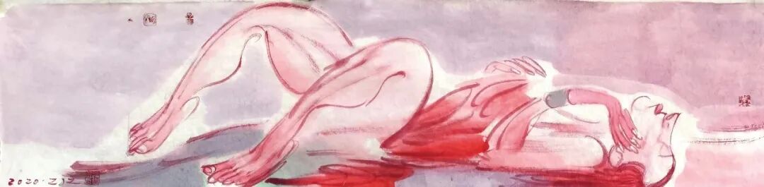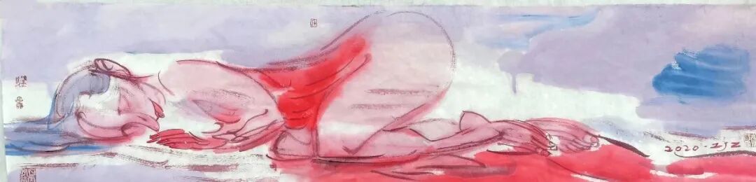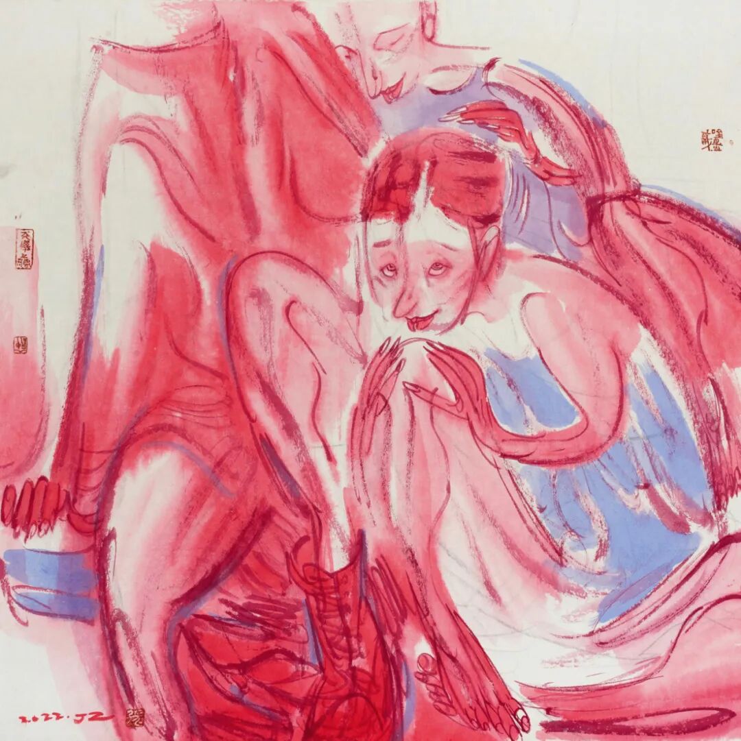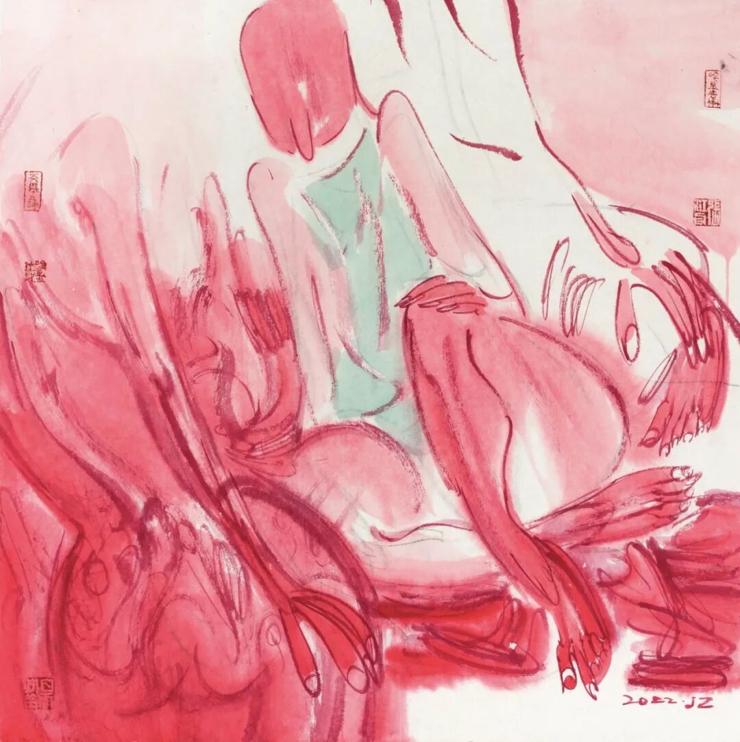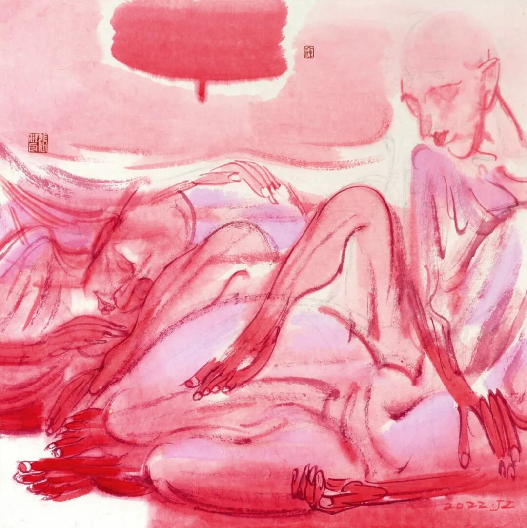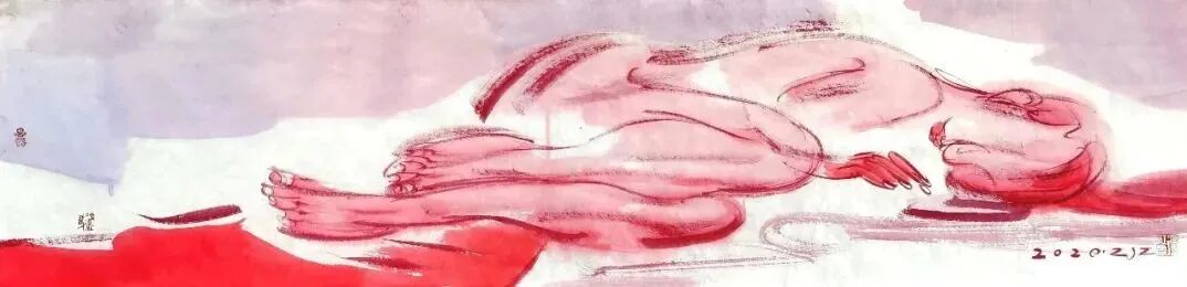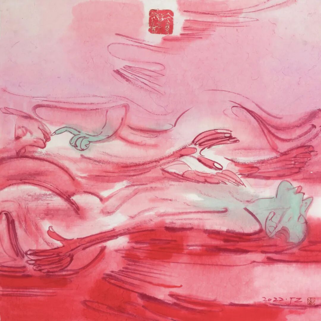 近期看到张江舟“躺平一族”系列作品,很是好奇。首先“躺平”这一网络热词何以迅速成为他的创作主题。再者,20余件作品没有了他一贯的以墨色为主的色彩基调,而是通篇的红颜色,强烈而刺激。是何种原因使他的画作有了如此的改变?带着这份好奇,编者采访了张江舟,试图一窥其作品背后的心理轨迹。
