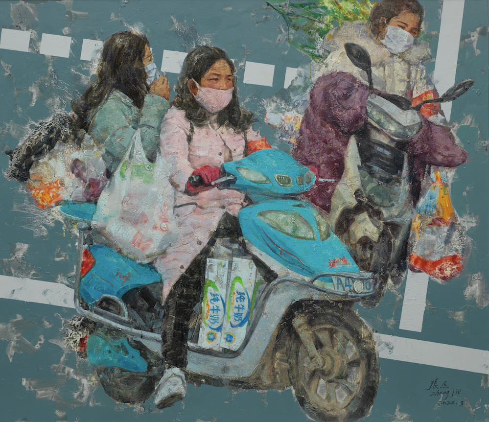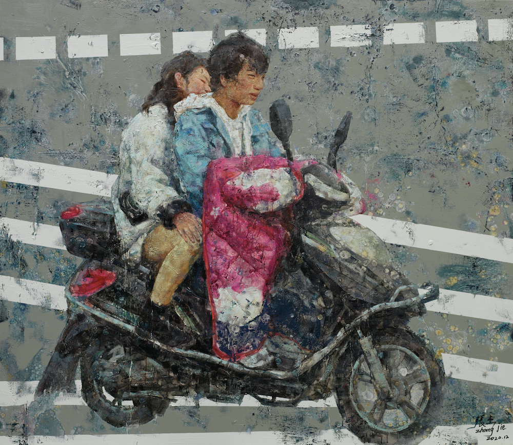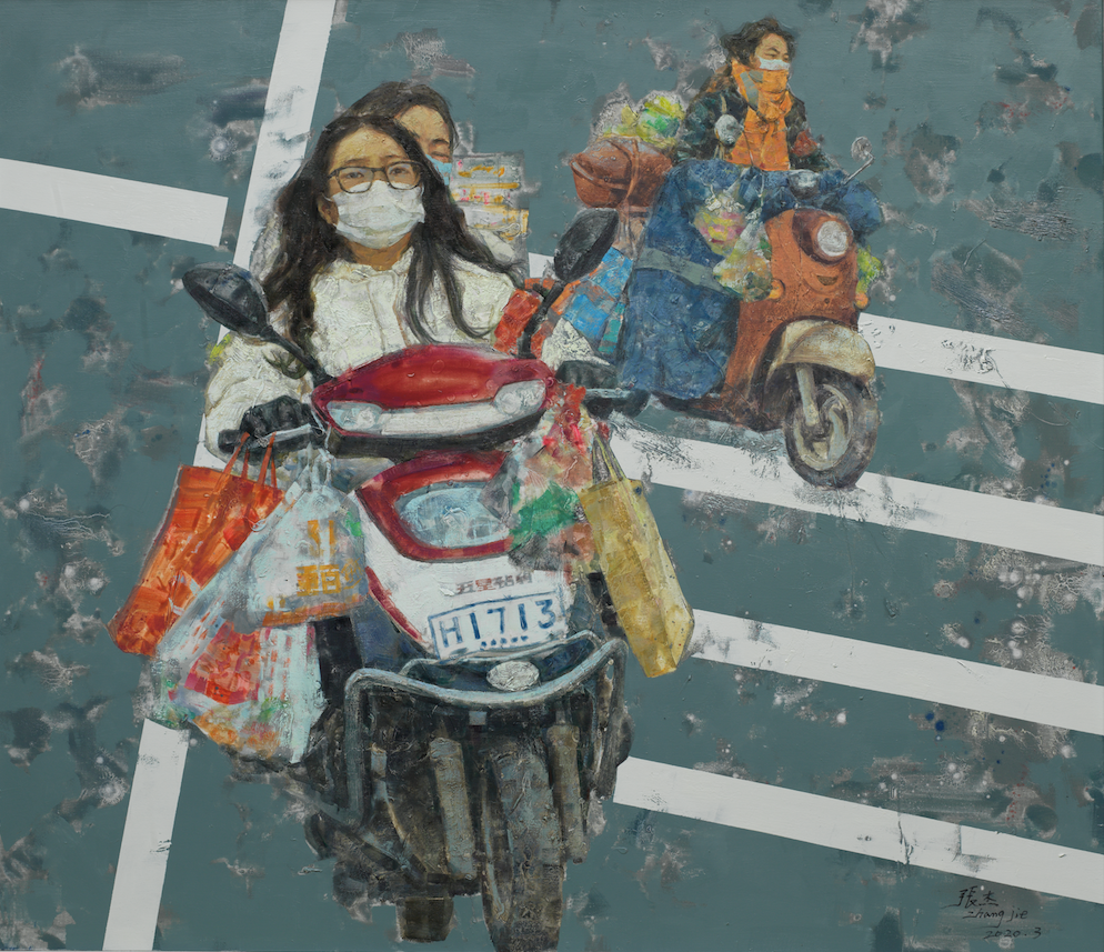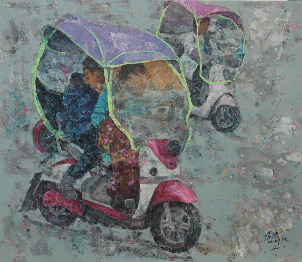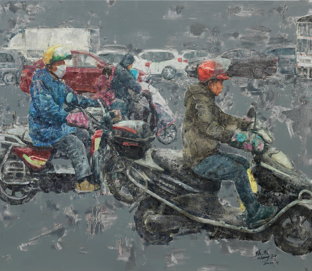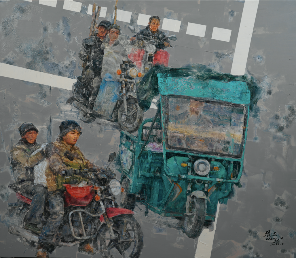 再如,“生活”的概念在张杰的画中就落到了日常的题材,形成其特有的人文情怀与叙事情结。比如烧香祈福的男女、离乡或返乡的人群,一个虔诚的动作,一张喜悦的笑脸,都可以成为画面的主题。这里没有什么重大题材的概念,防疫人员戴眼罩或穿防护服,城市的空巢老人在街头闲逛,小区的牌桌,街边的理发铺,这些司空见惯的市井生活小景,无处不充满生活的温馨和快乐。生活是多面的,也有烦恼和艰辛,但张杰的画笔均将这一切化解了。比如“追梦人”系列,画面的主体就是城市的打工族,人们骑着各式各样的摩托在路上。道路是交通的基本要素,摩托是交通工具,人借助摩托和道路不断地流动,“流动”似乎成为张杰诠释生活的一个关键词。