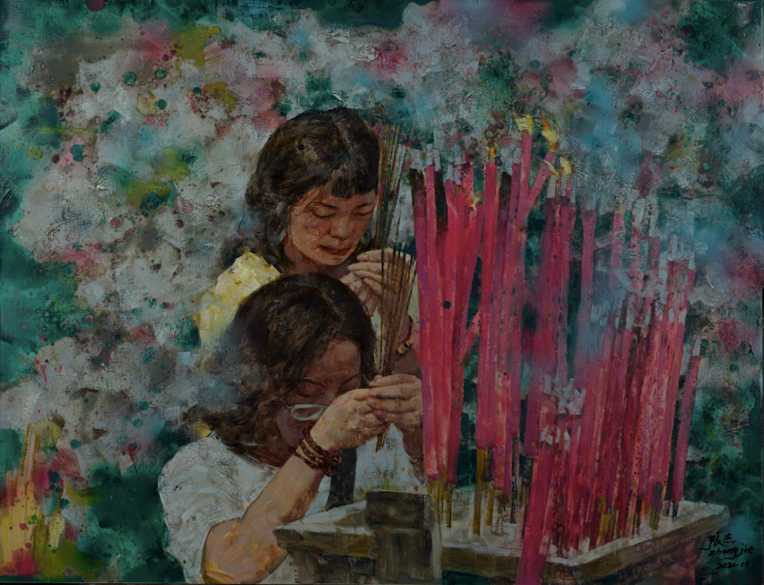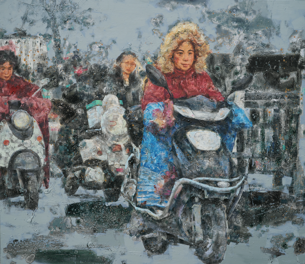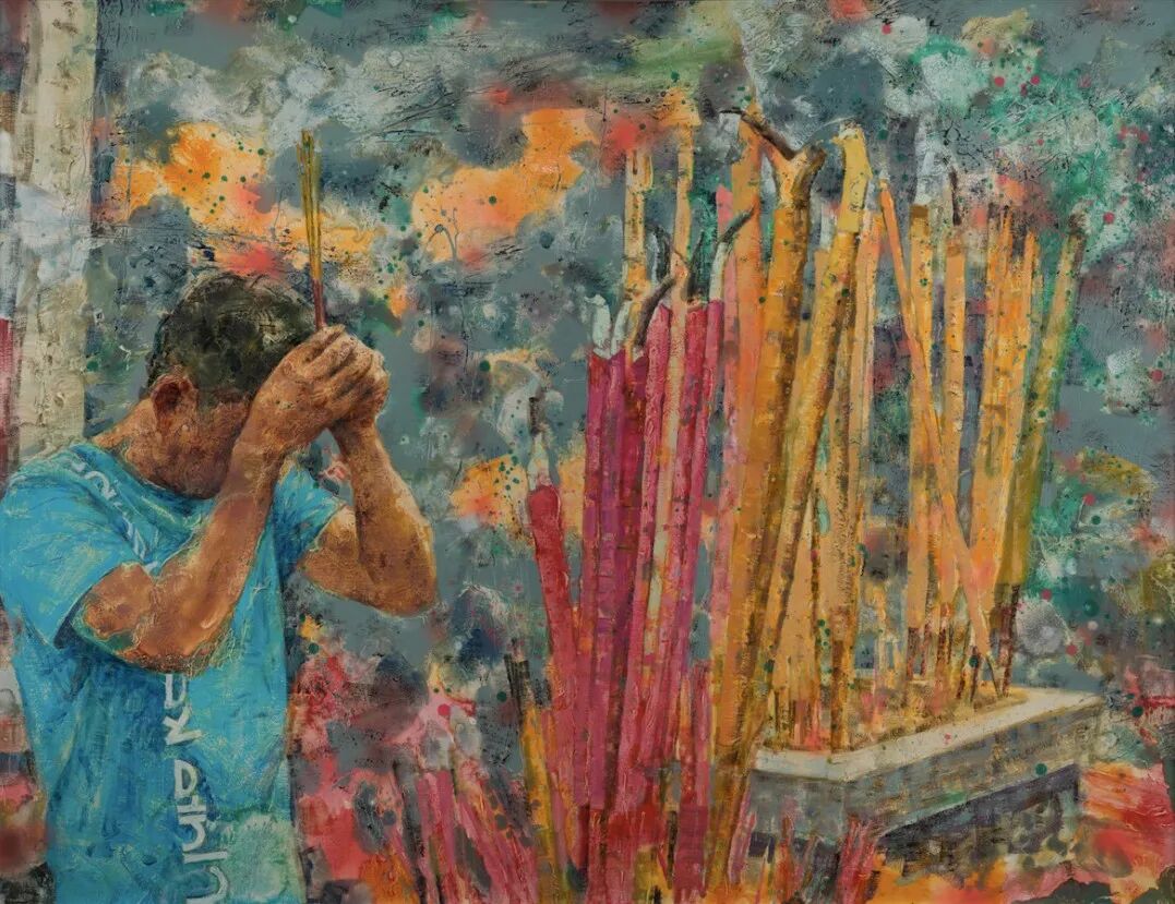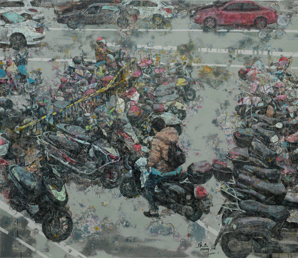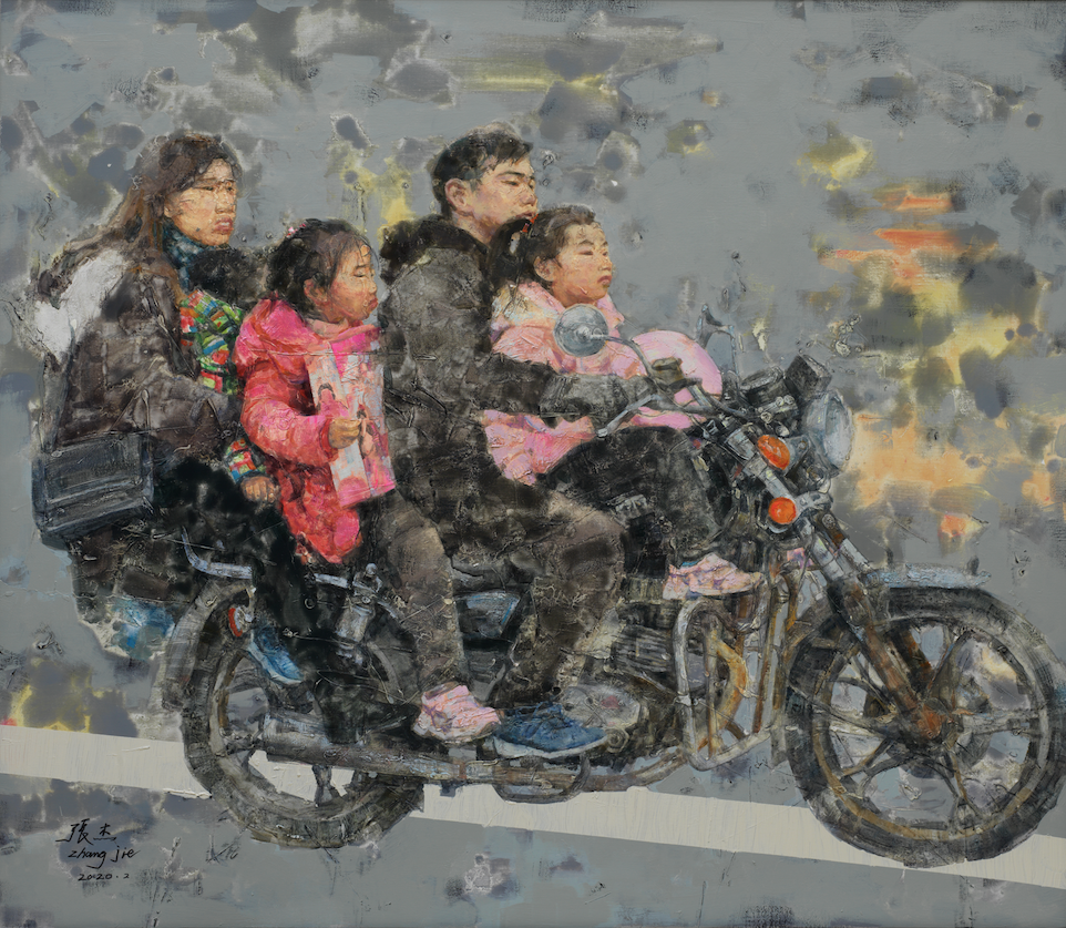 再如,“生活”的概念在张杰的画中就落到了日常的题材,形成其特有的人文情怀与叙事情结。比如烧香祈福的男女、离乡或返乡的人群,一个虔诚的动作,一张喜悦的笑脸,都可以成为画面的主题。这里没有什么重大题材的概念,防疫人员戴眼罩或穿防护服,城市的空巢老人在街头闲逛,小区的牌桌,街边的理发铺,这些司空见惯的市井生活小景,无处不充满生活的温馨和快乐。生活是多面的,也有烦恼和艰辛,但张杰的画笔均将这一切化解了。比如“追梦人”系列,画面的主体就是城市的打工族,人们骑着各式各样的摩托在路上。道路是交通的基本要素,摩托是交通工具,人借助摩托和道路不断地流动,“流动”似乎成为张杰诠释生活的一个关键词。