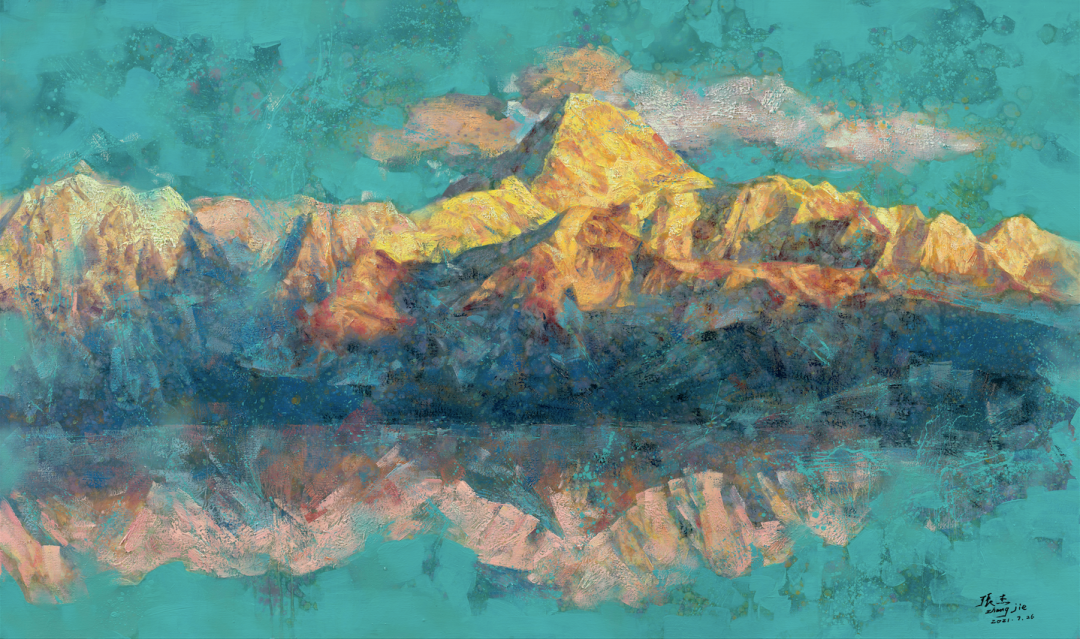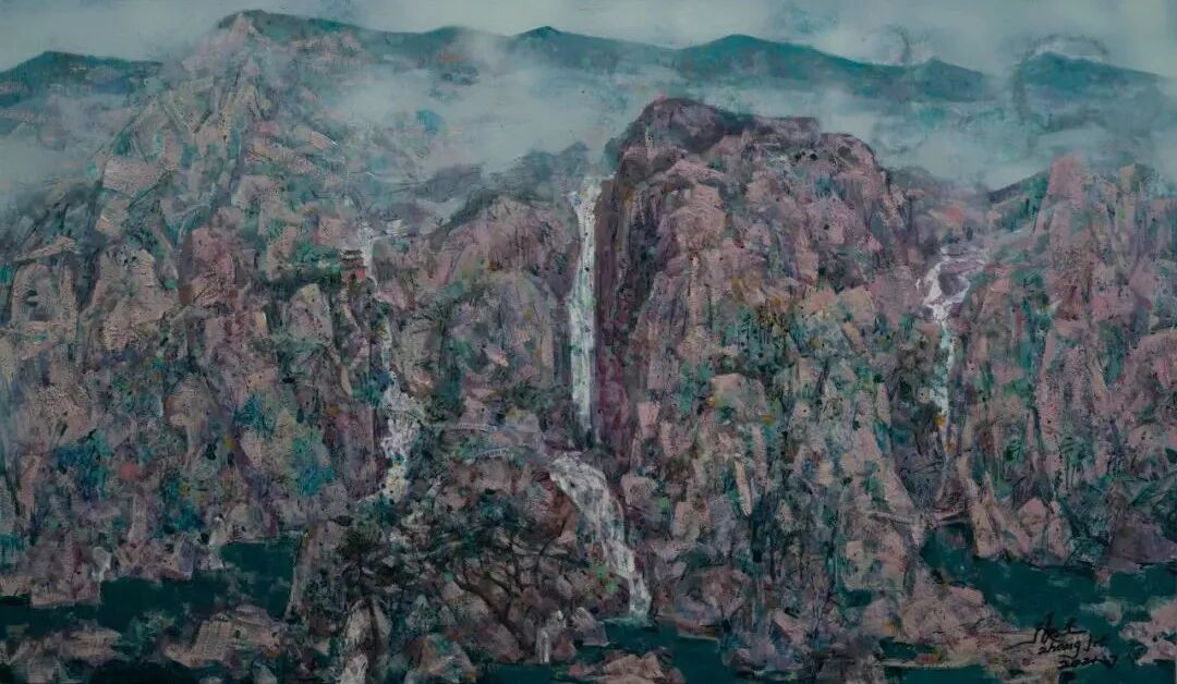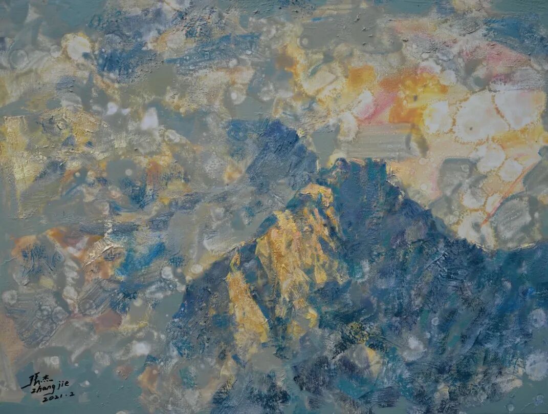 最后,“光阴”的概念在张杰的画中就落到了语言的形态,造成“斑斑驳驳”这一光影晃动的视觉印象。这是否意味着张杰将他眼前的一应事物,都纳入一个特定的时空关系,用瞬间的晃动的不确定的视觉感受,处理他画笔中的一切?斑驳的光影总是跳动的,与空气混合在一起,笼罩着事物,容易形成特定的氛围,并由氛围构筑语境。但“斑驳”的光影消解能力也很强,比如对形体的质量和重量,对环境的空间和时间,都具有消解作用。他画的《大地苍茫》《佛》《洒落的泪》及“破碎的风景”系列,在消解形体的同时,也消解了“光”与“光阴”物理属性,即从物理学转向了视觉心理学,同时带出了笔触肌理的审美特质,且不论具象还是抽象,如《余晖淡淡》《云中行》或《只是当时已惘然》。作为极具张杰绘画个性语言特征的“斑驳”这一概念,也只是借着“光阴”引发人的思绪,并不是其意义的最终指向。