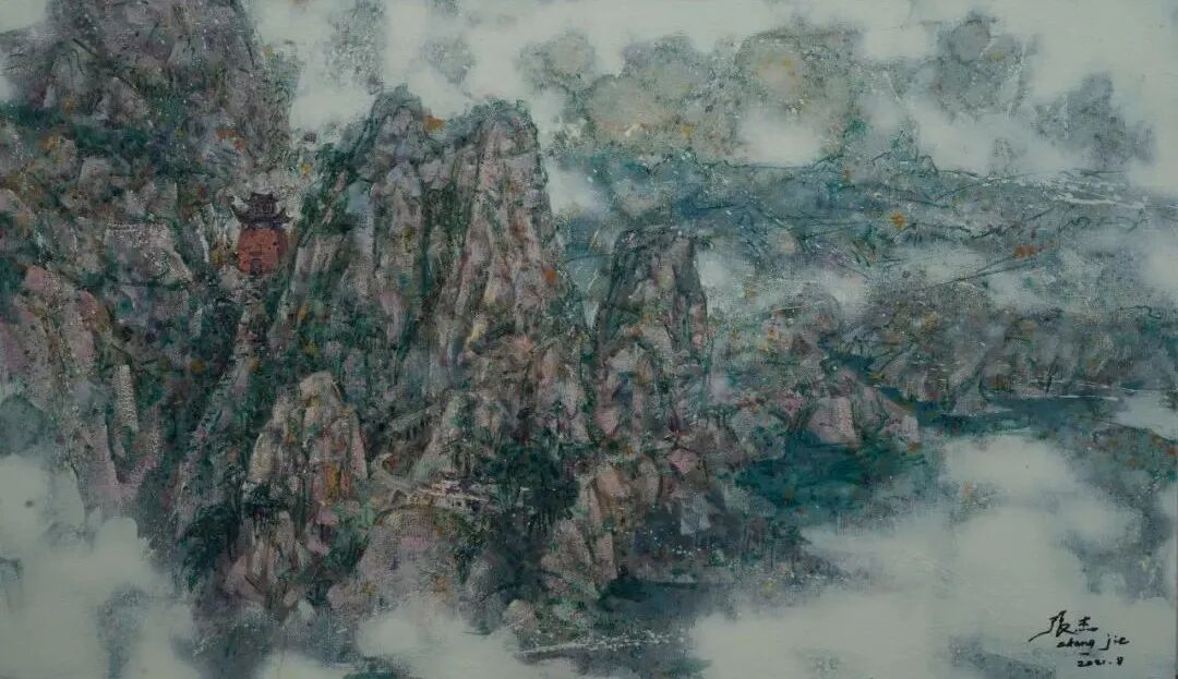比如,“大地”的概念在张杰的画中非常宽泛,可以体现为“中国风景”,也可以体现为“中国山水”。在中西方绘画中,“山水”和“风景”的意指不同,张杰是油画家,他坚持用“风景”,可其绘画意识中是否依然保存着“山水”的自然观?这一问题可以展开讨论。在《带红印的山水》《山水混响》《风景碎片》《红线》,以及“绿色印记”系列、“消融的风景”系列和“风景碎片”系列,其山体的绘画意识与苍茫的空间感,就是一派中国风,但又注意主体的人文印迹,将当下的时间嵌入,成为一段“风景”。中国人的山水意识基础就是“天地观”,这在西方绘画中不存在。