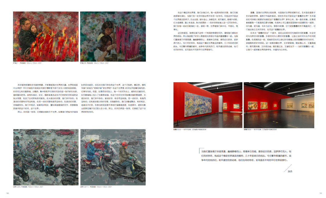 这次的展览,我想在展厅这样一个有限的物理空间内,重构我们感知世界的经验。所以我选取了时空上跨度很大的部分作品并置重叠在一起。当我们置身展厅环顾周遭:巍峨静穆的山,高楼林立的城,意恐迟归的亲,追梦奔忙的人,他们同时存在,构成这个确定世界真实的模样;几十年前老旧的码头,今日繁华熙攘的都市,战争年代的先烈们,和平盛世的劳动者,他们也同时存在,如同是在不同的平行世界里穿行。
