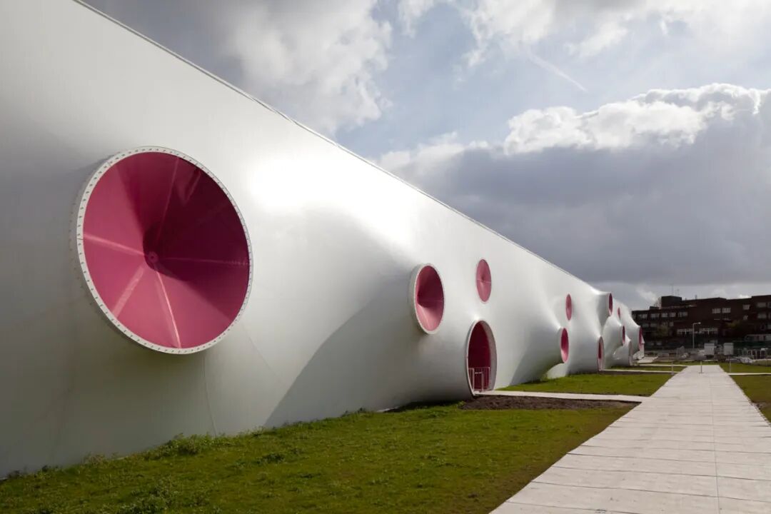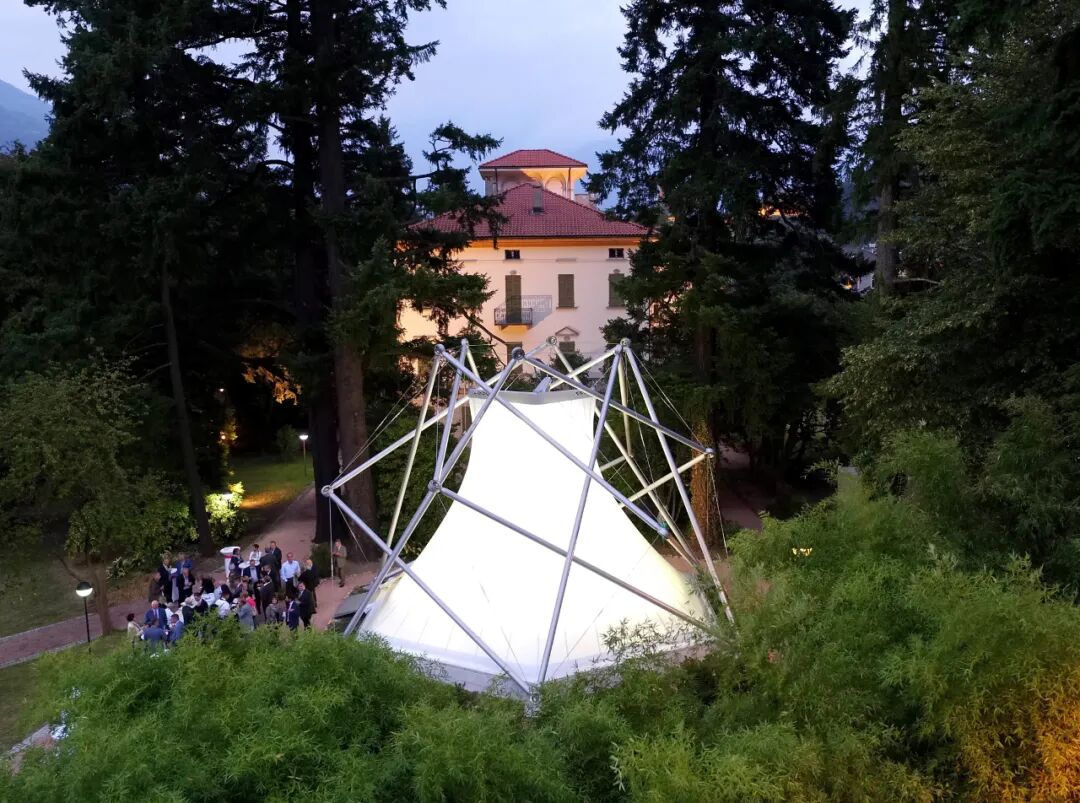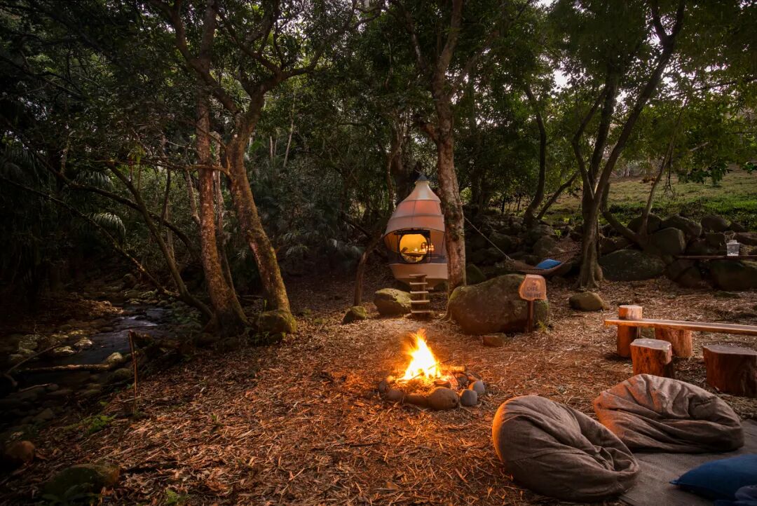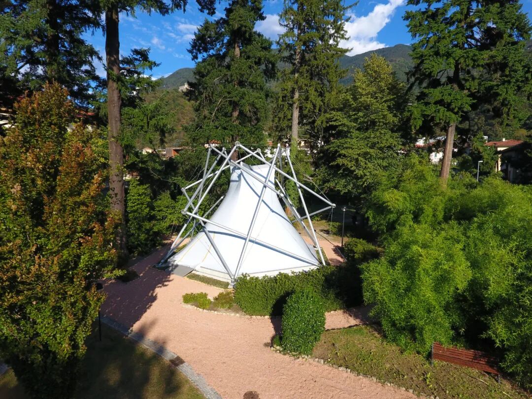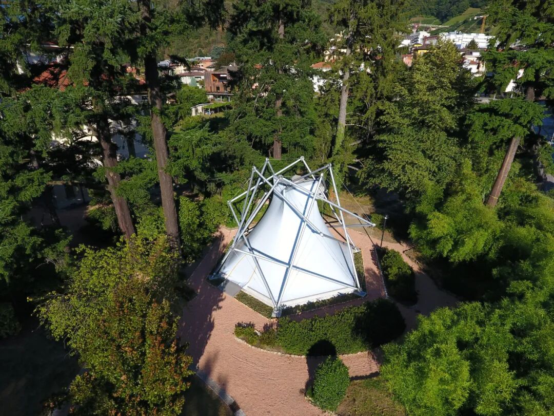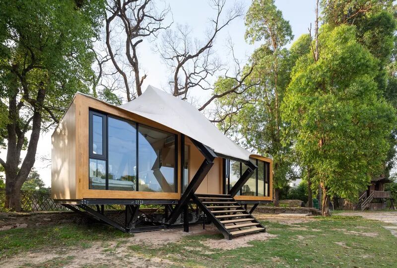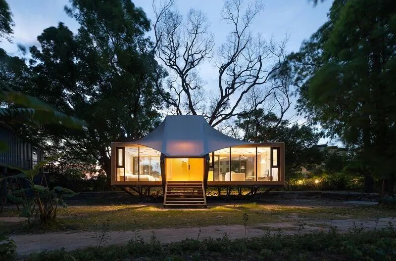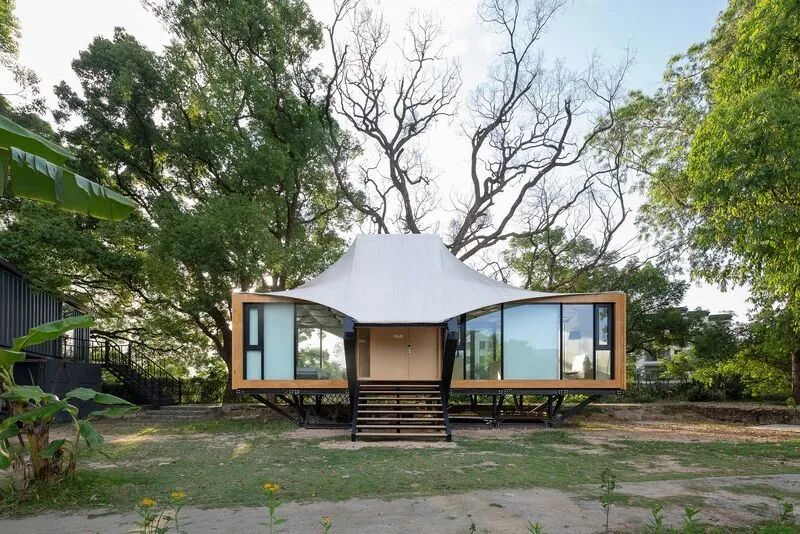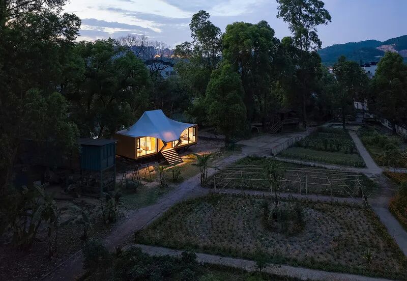该项目的创新点在于可拆卸的快速建造预制装配建筑,运用混合结构系统,结合没有一颗螺丝钉的榫卯工艺打造而成,也采用了定向重组竹、钢桁架基座及套框和膜结构屋顶。