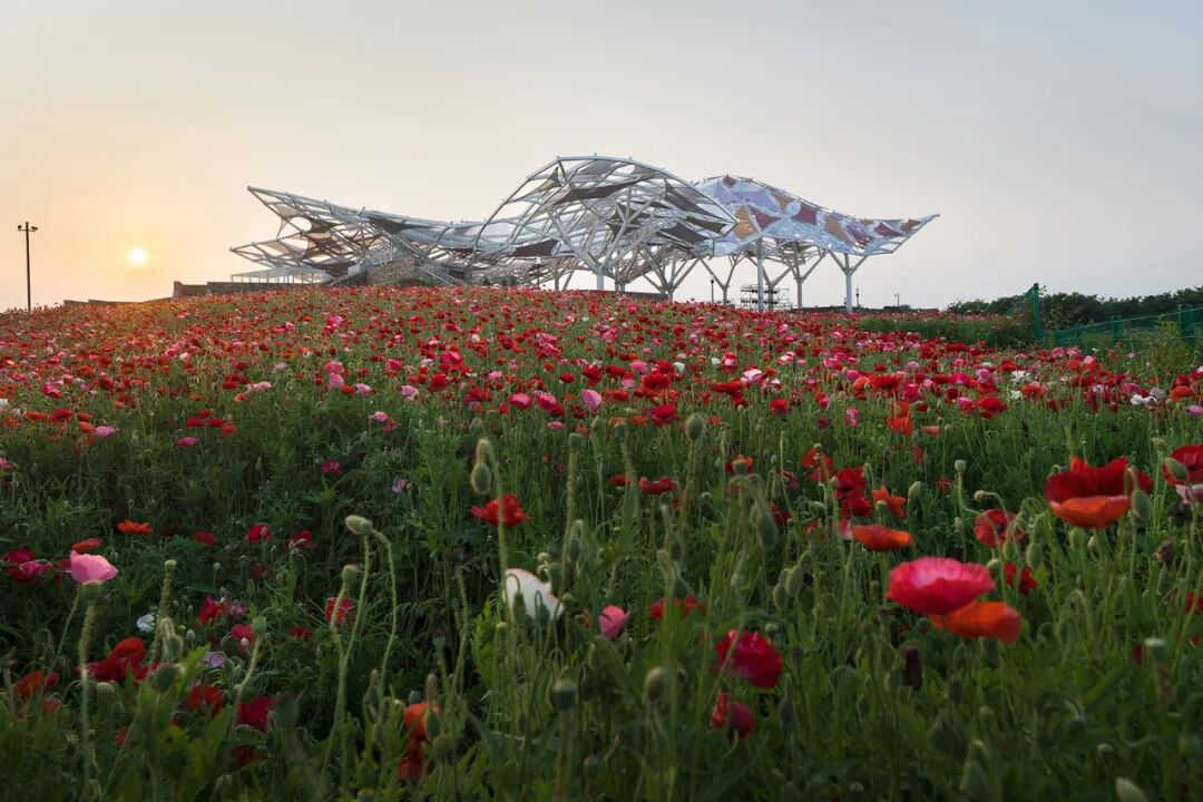 屋面三层张拉膜,中间透明膜遮雨,上下两层彩色膜遮阳。彩色膜的三种色彩呼应花田粉,黄,紫三种颜色。