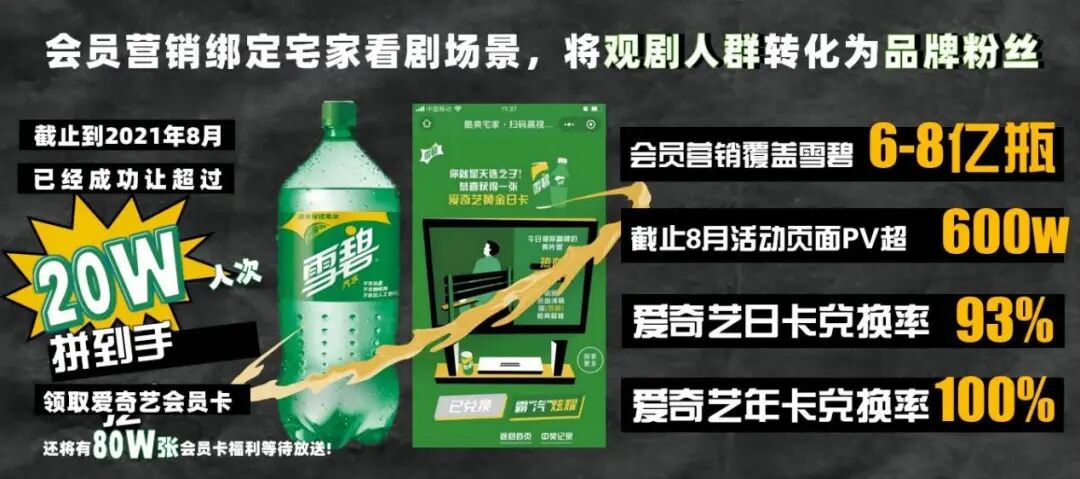 此外,爱奇艺与雪碧共同推出“扫码赢视频年卡”活动定制饮料。在头部大剧当中通过引流,将用户引导至官方小程序注册会员并赢取不同的视频会员福利。