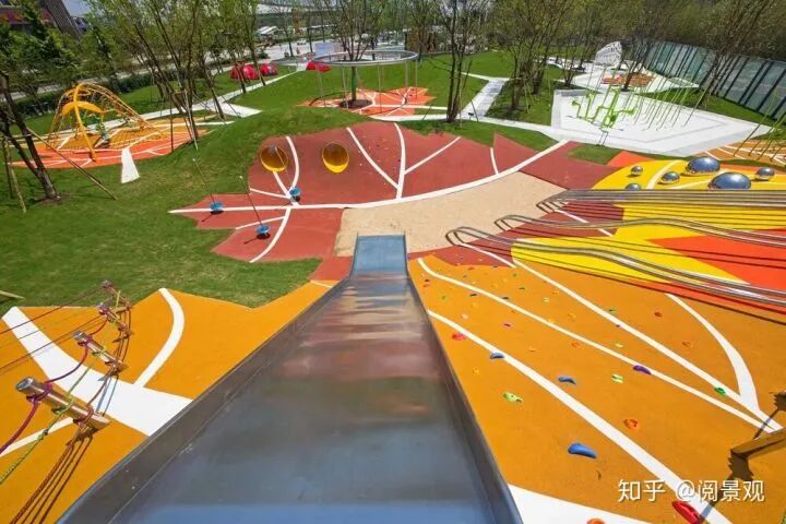 游乐器械放置的位置,使用塑胶地坪做成枫叶的形状,并与草坡地形完美贴合。
