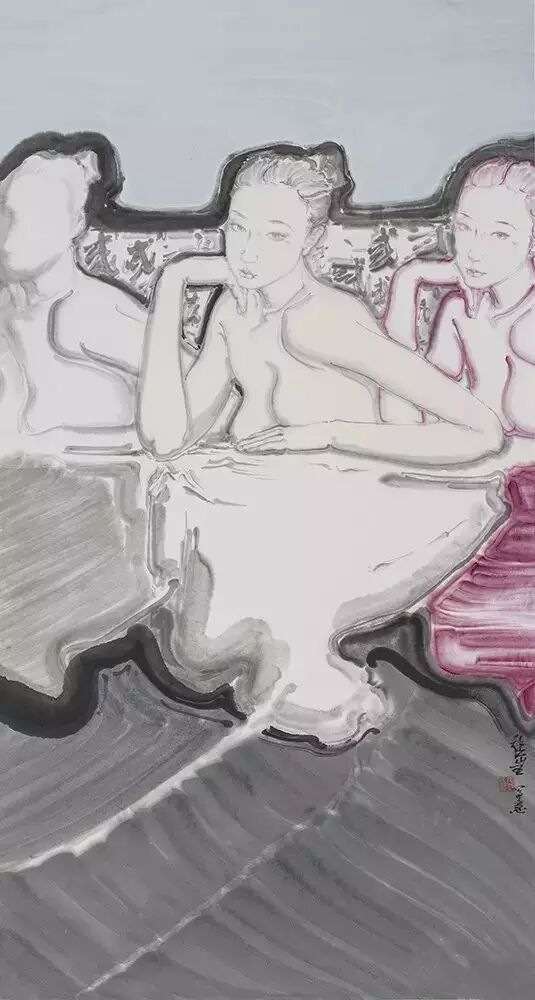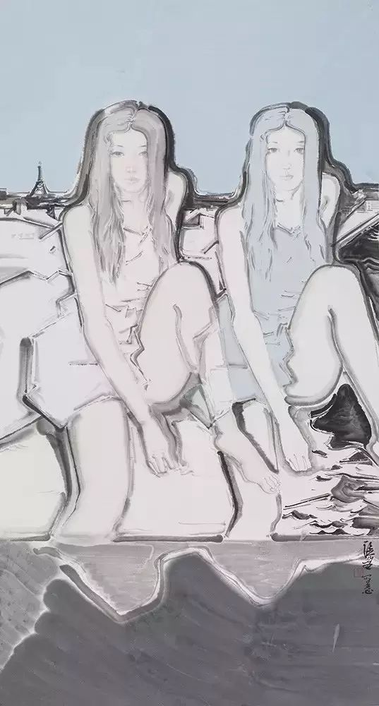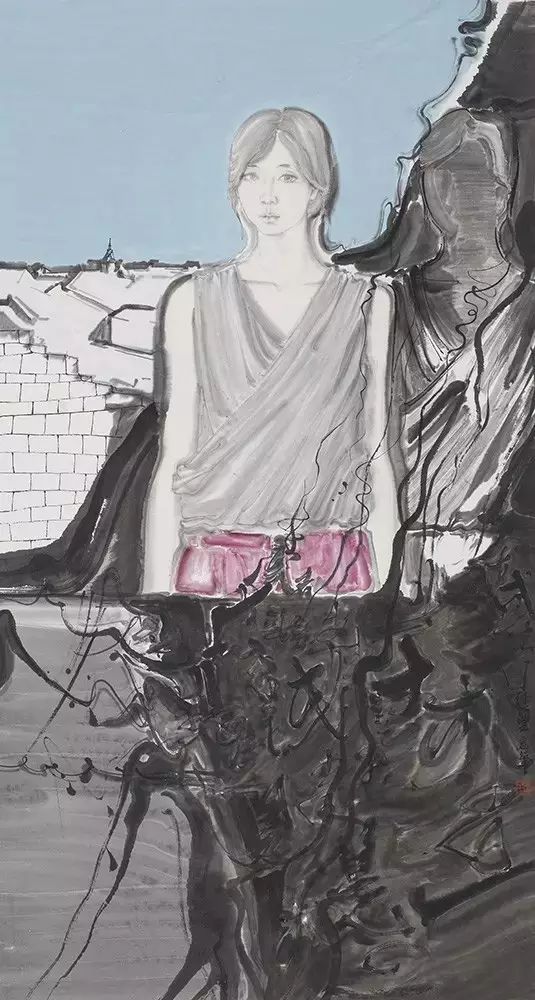 张望的都市系列以象征的方式将人物置身于都市的结构中,其形式的张力和笔墨韵味围绕着人的生存状态展示出都市人的清新之觉与矛盾的恍惚感。笔墨对于都市的表现是新课题,因为它面临着许多矛盾的因素,由传统审美的笔墨方式向都市表现转型其面临是笔墨所承载的审美内核,那么在都市水墨的状态里张望既遵守和持有着传统的审美性,如人物形象的刻画,造型的学院方式,笔墨的干湿浓淡与渲染的章法等。同时张望又感知着现代的文化基因给笔墨带来诸多新的感觉,他拥有着画法从属内心的空间,从属时代给予的生活思考,以此,张望在探寻着看到与感觉的交流,形象和本质与文化理念的交流,传统与现代的交流,方法与新方法的交流,他们都在理念的发现中进行着不间断的体验与思考,张望在人物造型语言和笔墨语言上做出了新的尝试。