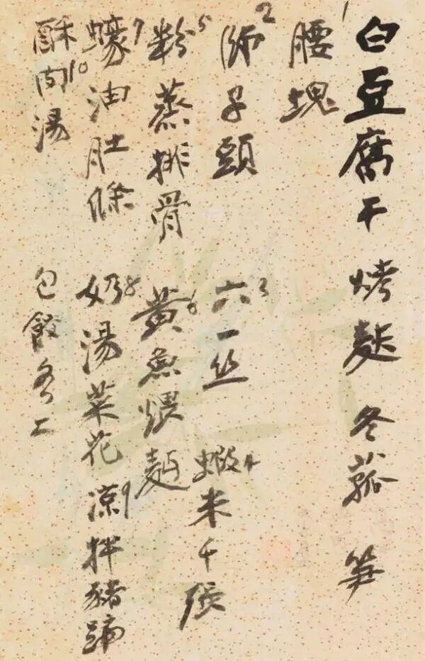 相信,不少朋友曾经看到过关于张大千手写菜单的拍卖记录,虽然是寥寥数字,但是却被人称之为书坛之绝唱,张大千宴请张学良,而张学良还顺走了他的手写菜单,还成就了一段佳话,并且张大千的手写菜单,看似随意,但是不随便,书写的十分饱满,而且还非常见碑帖功夫,这也许就是很多朋友看中的地方吧,众所周知,张大千,可是画坛里最具有传奇色彩的大家,不仅绘画思想,对后世影响颇深,而且他的绘画作品,还成为后人无法攀登的高峰,而对于他的书法,很多朋友却不怎么感冒,而对于他的手写菜单,却有不少朋友盛赞不已,下面就让我们一同来欣赏一番他手写菜单吧。