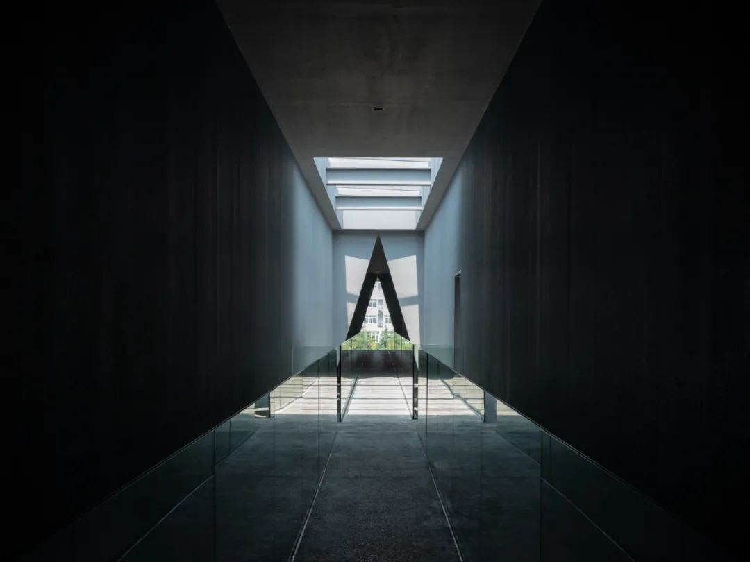 从地下展厅的天窗仰望庭院水池中游弋的小鱼