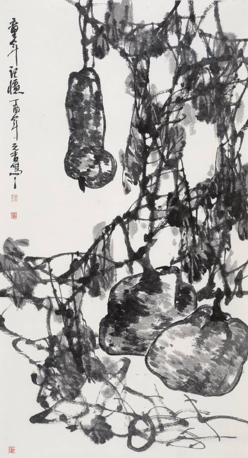 明代沈周在绘画中将篆榴、行草、隶楷及飞白等书法笔意完全融入花鸟画创作之后,白阳、青藤使狂草的笔意充分用入创作中,后来八大、吴昌硕将草篆、金石之笔意在绘画中的运用,形成了各自独特的绘画语言。如白阳的花鸟画,显示出充分的书法造诣,草书的抑扬起伏,驰骋纵横需要感情驾驭,便于表达个性、抒发情感,勾点、皴擦、渲染皆即兴发挥,线条纵横反侧无懈可击,且他有强烈的绘画意识,从而保证了每一笔都能落实到具体的绘画创作中。因为任何线条只有落实到造型中来,才具有现实意义,这就是写意真放的精微所在。所以我们在写意创作中,对每一笔提出了很高的要求,无一笔不藏,无一笔不收,笔笔接气,笔笔有度,因此我们常说,笔的薄与厚,在于用笔的起行收。