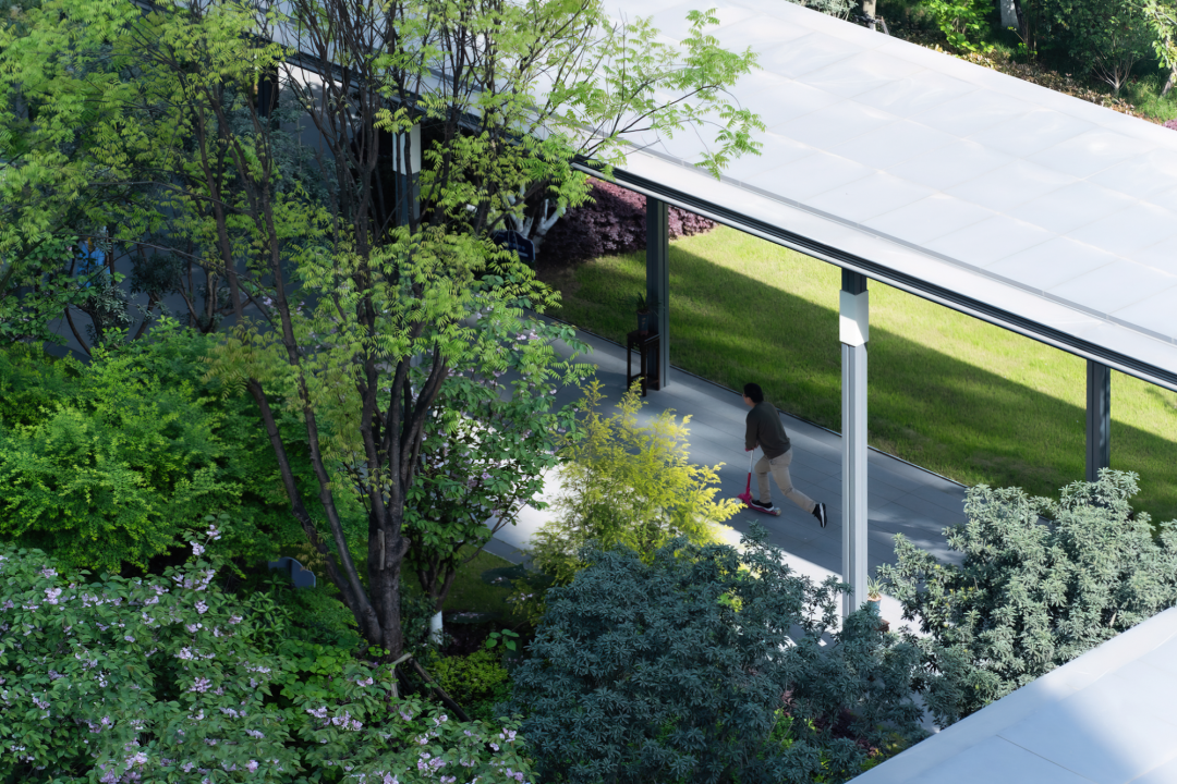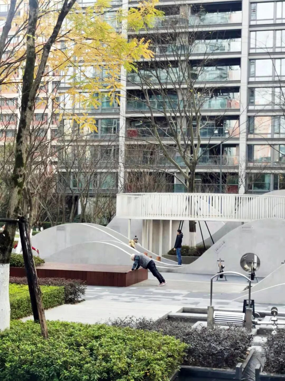 在设计之初我们特意加宽廊道的宽度,因为通过调研,重庆业主喜欢游走,而坐的少,图片可以看到小朋友滑滑板,大人们就近活动的行为捕捉。