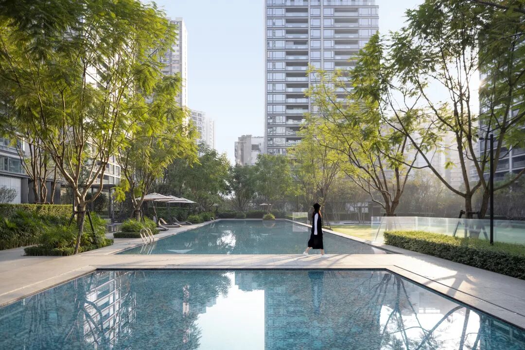 张樟:蘭园的结构,是由“一芯三环十院”组成,所有的设计故事还要从这“一芯”开始。原先的几稿构思中是没有这个大草坪“芯”的。因为重庆的大草坪通常是不让业主进入,它常被划为“省成本”“低造价”的景观系列。我们一开始,像很多绿城经典项目处理轴线礼仪空间一样,把泳池南北向布置。但是,当我们深入了解绿城在后续的经营中,有足球社、海豚计划后,其实整个团队为之雀喜。我们坚定的放弃了中间泳池,两侧各自为政的庭院布局模式。因为我们坚信人的互动交流,哪怕只是看见别人的笑和快乐,自己也是会被感染的。我们那时候就已经开始做梦,希望当业主回家时,活跃的邻里活动氛围、生活气息,能成为业主回忆里的幸福时光。