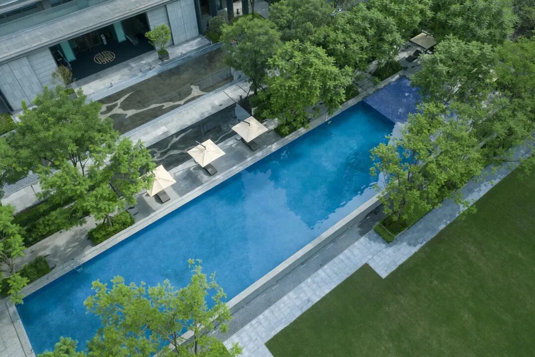 推开大堂之门,一幅水岸礁滩呈现在眼前。消防登高场地的浅水,同泳池一起,把天光云影借入院中。我们希望借自然来做功,借地处高势的开阔感,把畅怀的心境同南入口树影下水面呈现的悠然,做一次反衬,以此丰富的整个内环的水景感受。而此处的树种,我们依然选择羽状复叶的乔木,因为它除了具有“人闲桂花落”的恬适,它还能组织起一张柔软的网,让在泳池游泳的人们能够感受到自然的亲抚。在我们的眼里,每一种树都有自己的性格,能够带给人们不同的感知,就像同是沙发,表层用麻或者皮革给人的触感是完全不一样的。
