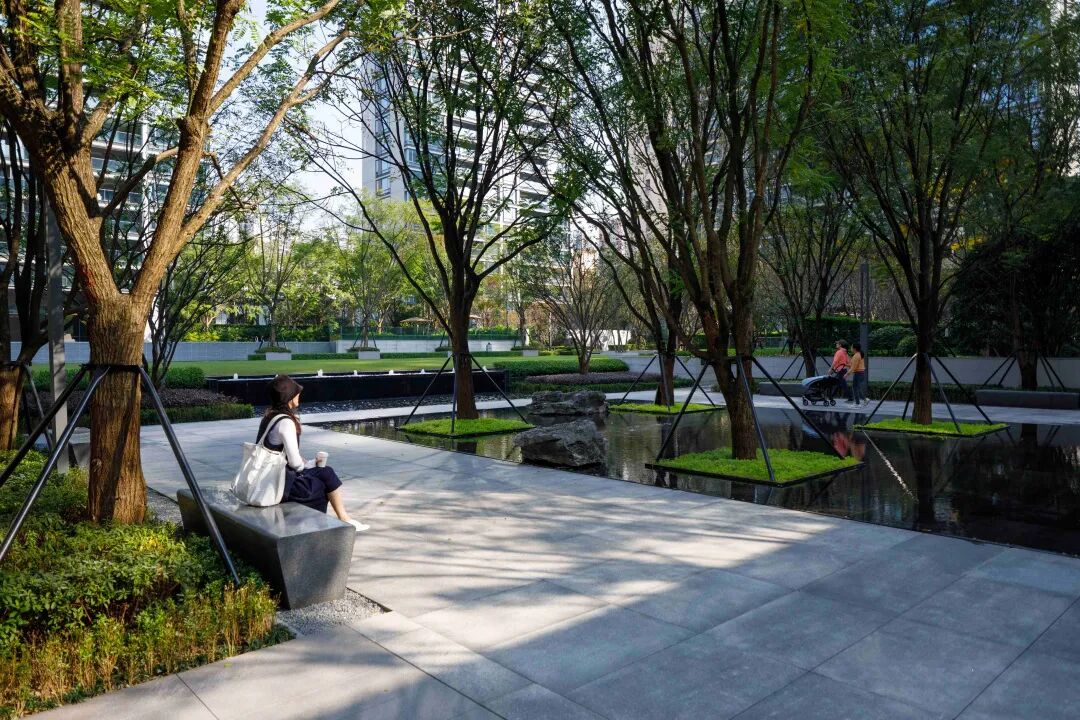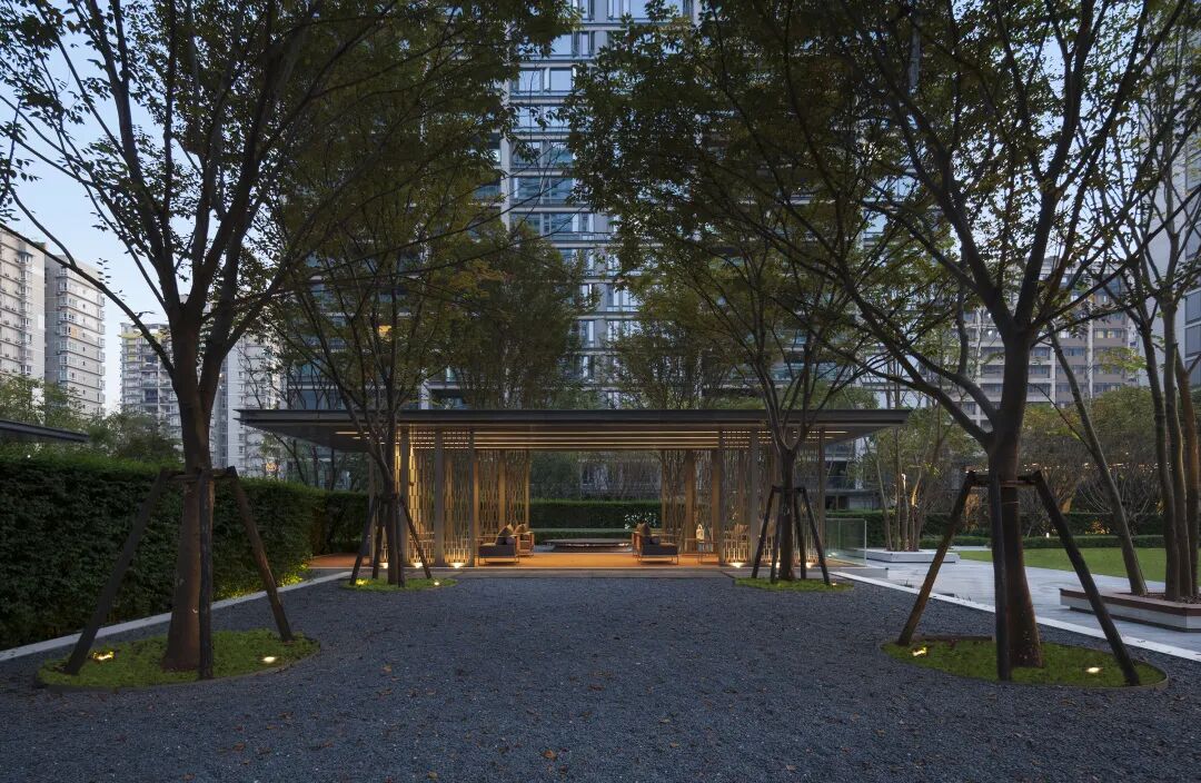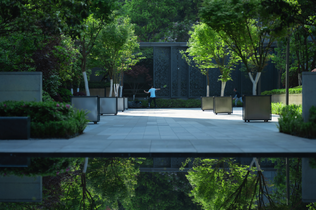 在此,照壁外的的繁华和里面的宁静,是截然不同的两个世界。我们不想做一个安静的场景,因为它太冷了,没有鸟鸣山更幽的反衬;我们更愿意做回“宁静”,它是身心放松重启家生活的节奏。因此,在建筑已然撑起的仪式下,我们把示范区的置石找回来,让水面静静的淹过消防车道,在轻巧的槐树枝叶的指引下,把视线带向那充满欢呼雀跃的大草坪。我们相信业主归家看着欢歌笑语的场景会远远超过某个静态的艺术品。而之所以选槐树,是因为它舒朗,羽状复叶的飘落能使坐于处的人们产生“人闲桂花落”的恬适之感;同时她暗指“三公”,寓意美好,能够把江南那一抹人文气息丝丝入扣,而无做作的引入园中。