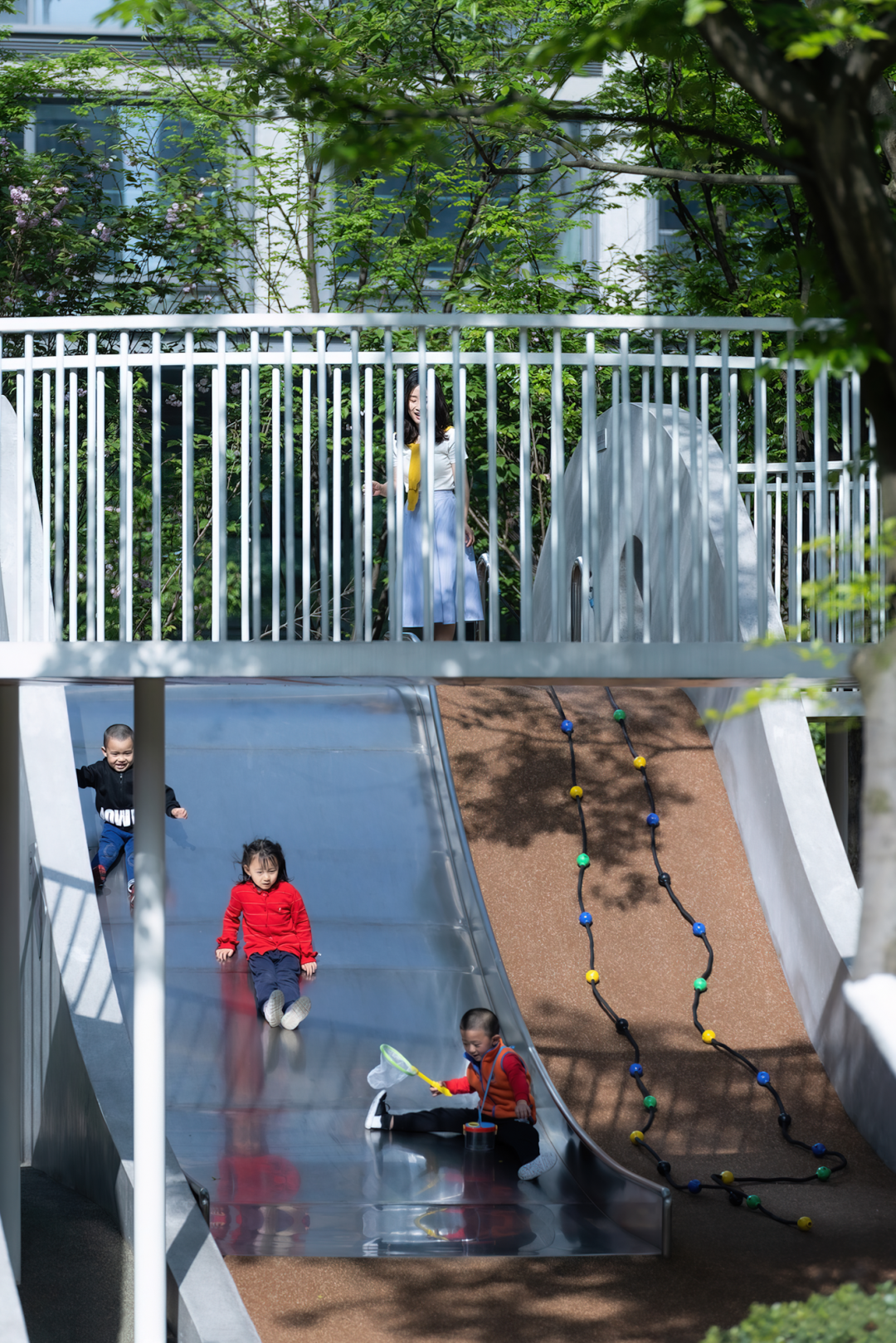二是因为这个场地是去器械化的、去低龄童趣的。捉迷藏本来就是老少皆宜的一种活动,我们希望它不应该只是儿童的领地,而应该是家长和小朋友都能待得下、互动得起来的区域。为了使其能成为一个名符其实的高强度复合性人群使用的场地,我们从选址、周边场地的嵌套关系、家长使用方式、儿童心理行为等方面做了许多的尝试。关于这个区域,我们会在后续有更加详细的文章解读。