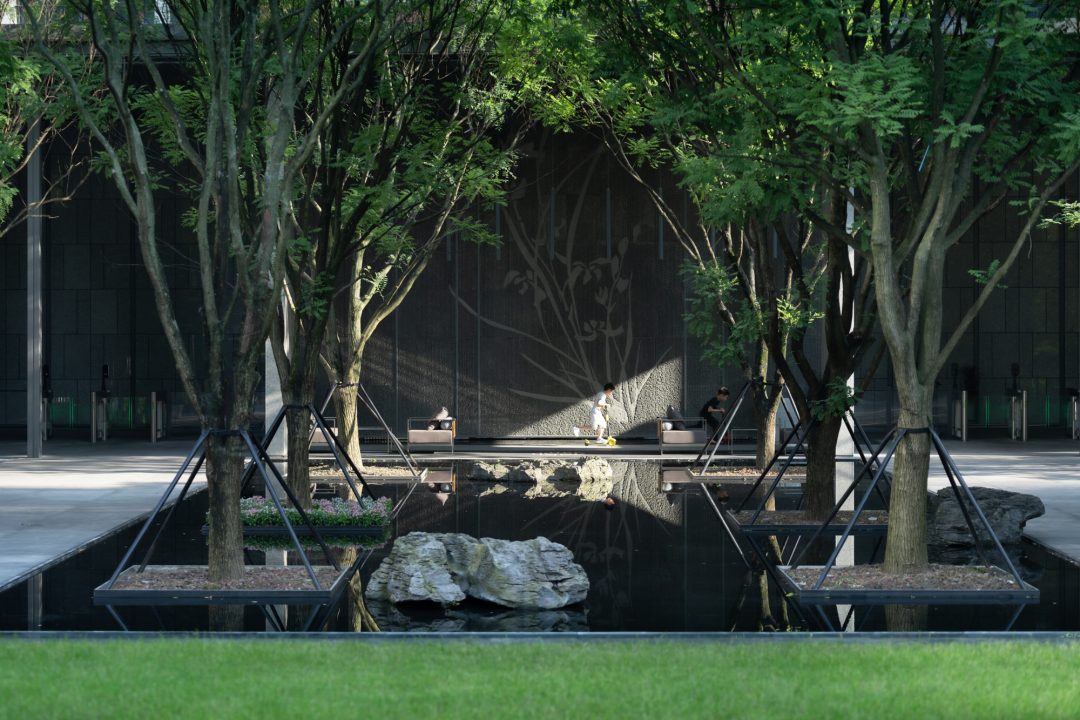上层偏安静,松软的碎石托起明确序列感的榉树,一个横穿的廊架,给人们凭栏眺望、小憩畅聊的机会。廊架边的低矮水盘,又为此处的人们带来了温润的空气和淅淅沥沥水落石鸣的天籁之音,它同轴线另一端的片墙雕塑纺织起宁静的序列空间。