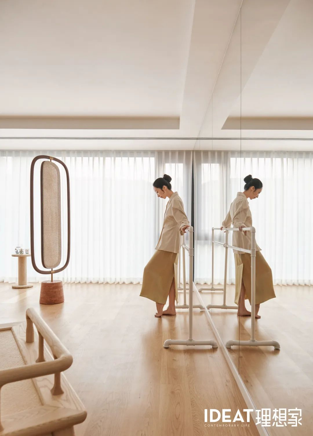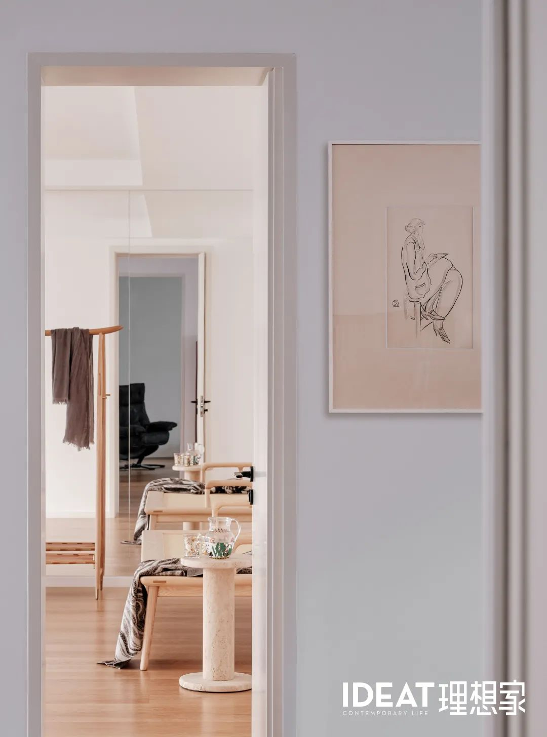 吧台旁储物柜没有沿用旁边玄关的深木色