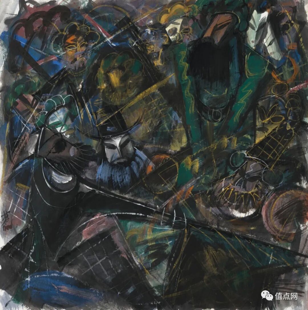 林风眠如何以一帧平面画作表现《过五关》一剧二十场?他把人物以上下层叠的方式表现,呈现出混沌复杂、战气沸腾的氛围。与其说这是戏中某场某段,不如说这是观戏全场下来所得一种印象。