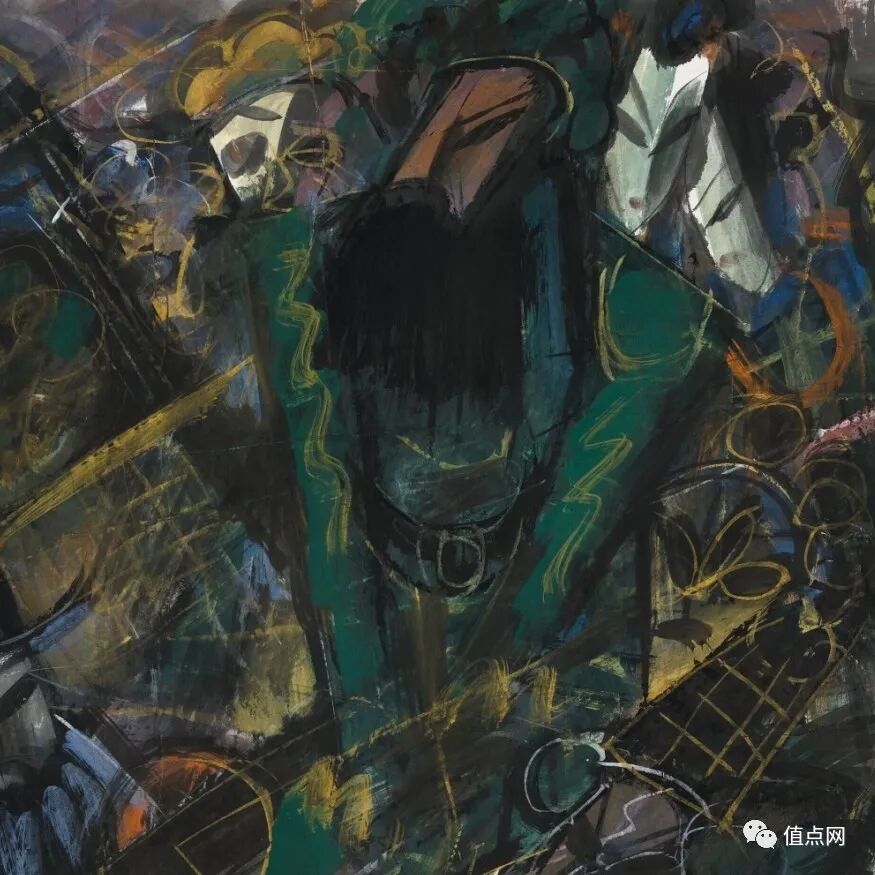 画作构图方正,是典型的林风眠格体。色彩满纸,人物隐约其间,简化成几何形,明显可见画家借鉴了西方立体主义风格。人物之中,可辨识者只有关公,绿袍青巾,美髯一把。其余人物交错穿插,刀光剑影,密不透风,气氛紧凑炽热。