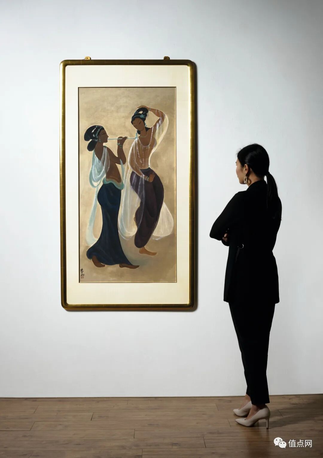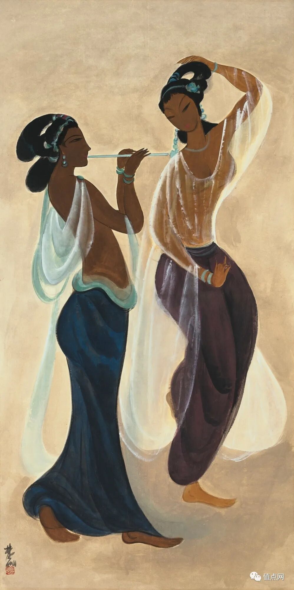 此幅《敦煌乐伎》以淡灰色作地,不单视觉上更接近壁画的墙体,也跟人物的深赭肤色更为谐协。画面绘伎乐二人:吹笛者取正侧面,垫脚而立,曼妙轻盈;独舞者,摇手舞腰,翩如兰苕。二人上身皆罩以轻纱,飘然若仙。整幅作品优美典雅,色彩单纯沉静,充满古典意趣。