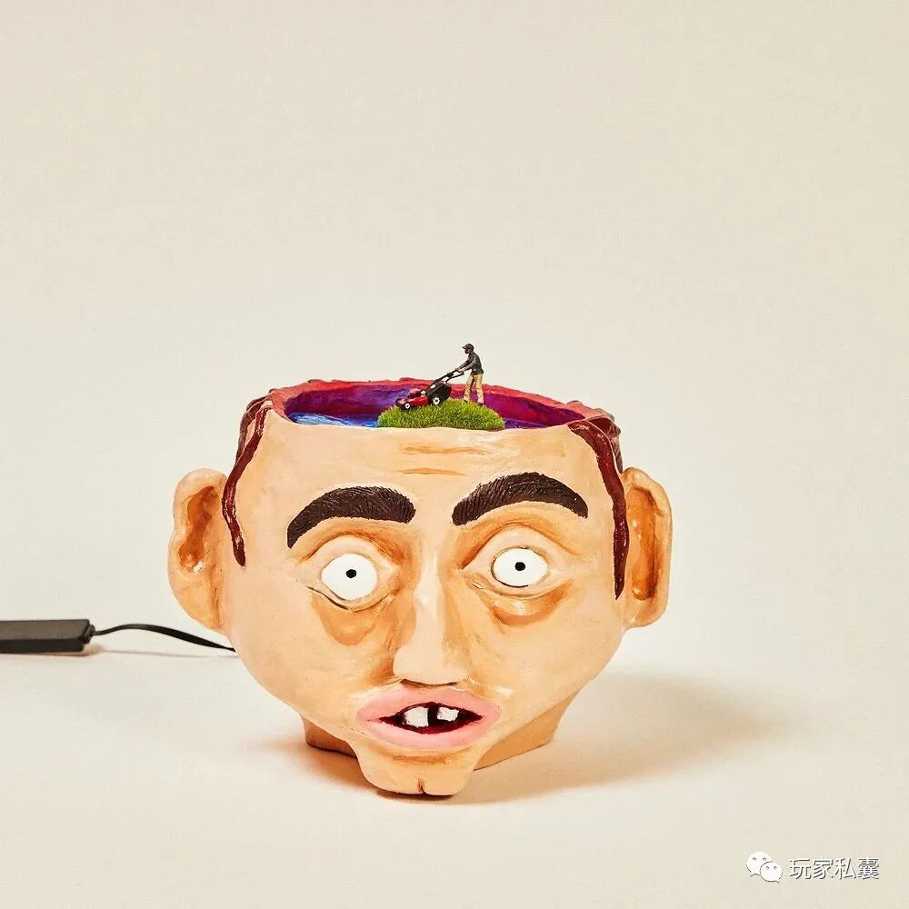 售价5000美刀的“脑洞大开”灯使用陶瓷、亚克力、LED、薄纸、泡沫、泥土以及改装过的玩具屋打造而成,设计师本奈特想借此设计表达一个幽默的灵感——当你头疼的时候,很可能正有一个勤劳的小人在你的脑子里锄草。