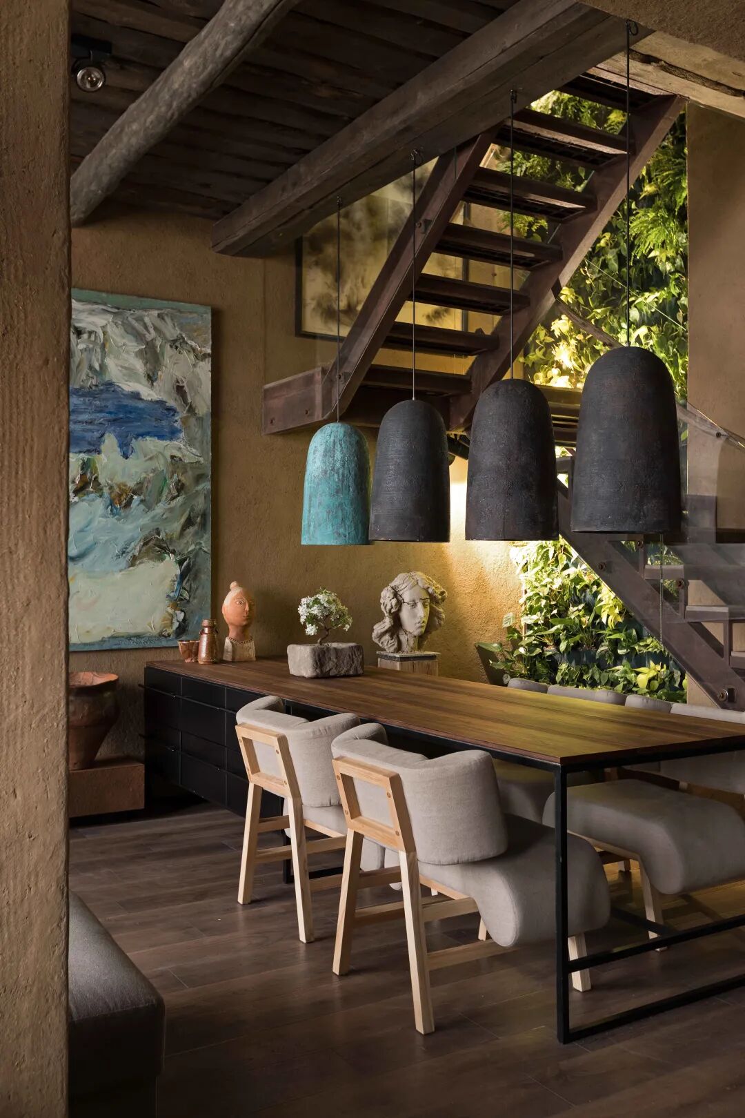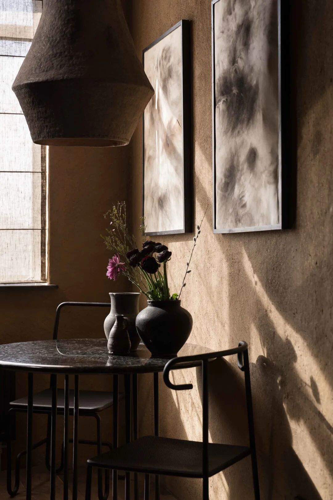 在这个时空里,抬头,木质横梁古朴粗犷,环顾四周,粘土墙壁质朴天然。源于自然材料的手工制品随处可见,带着温度,洋溢着情感。它们的不完美,是侘寂这种古老的东方美学在现代设计中的完美演绎。