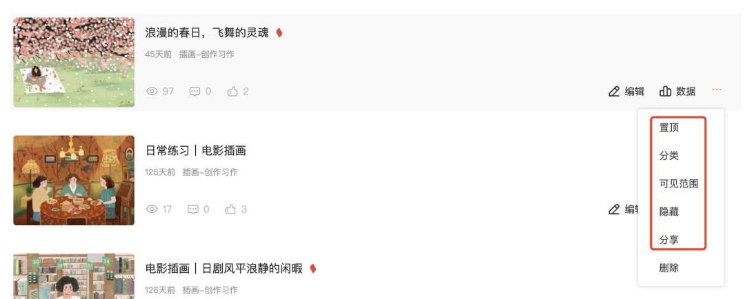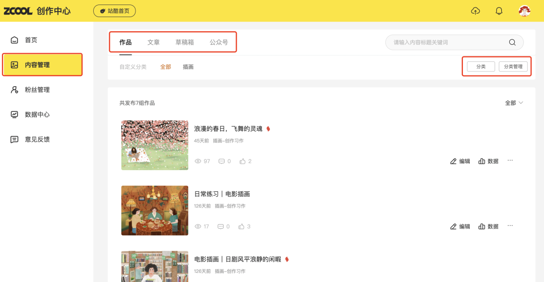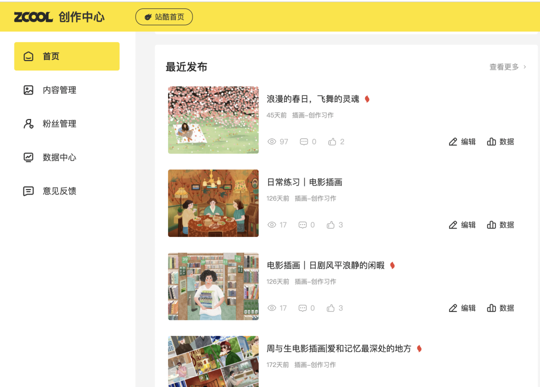 你发布的所有内容,不管是设计作品、设计文章、设计视频,都可以在【内容管理】下进行统一操作和管理。
