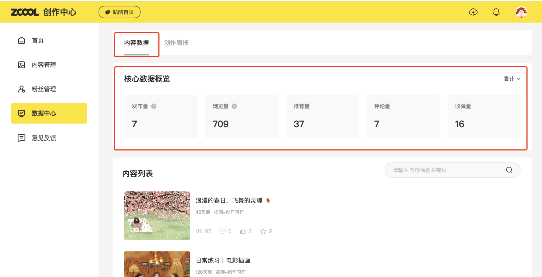 打开创作中心的首页,与你有关的创作数据一目了然。