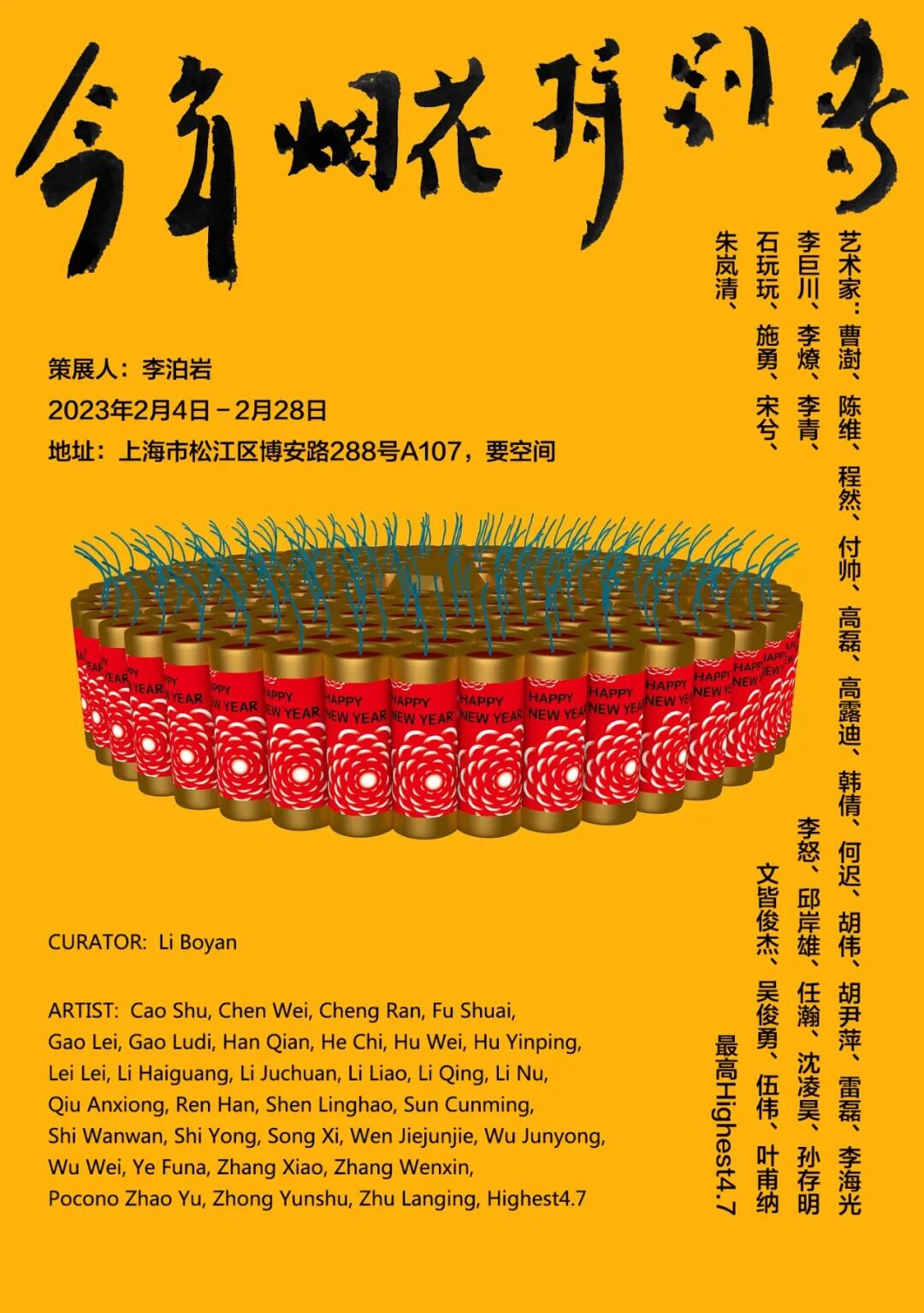 艺术家:曹澍、陈维、程然、付帅、高磊、高露迪、韩倩、何迟、胡伟、胡尹萍、雷磊、李海光、李巨川、李燎、李青、李怒、邱岸雄、任瀚、沈凌昊、孙存明、石玩玩、施勇、宋兮、文皆俊杰、吴俊勇、伍伟、叶甫纳、张晓、张文心、赵玉、钟云舒、朱岚清、最高Highest4.7