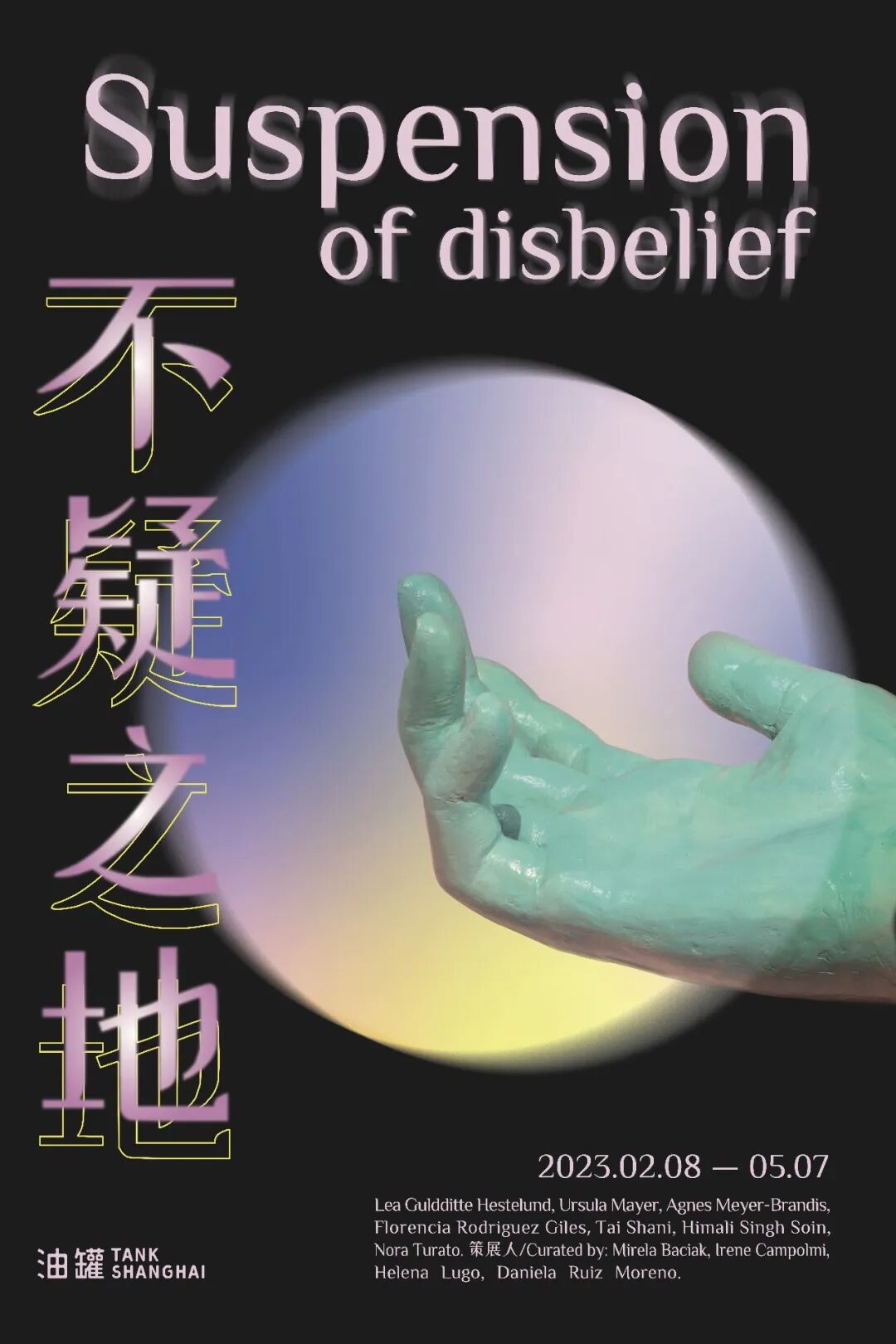 展览由“油罐策展人奖”的获奖项目的四位获奖策展人:米瑞拉·巴希亚、伊琳· 坎波米、伊莲娜·鲁格、丹尼拉·瑞兹·莫瑞诺联合策展,展示了艺术家莉亚·古尔迪特·艾斯特伦德、厄休拉·梅耶尔、阿格尼丝·迈尔-布兰迪斯、弗罗西娅·罗德吉斯·吉尔斯、泰·莎妮、希玛利·辛格·索恩、诺拉·图拉多的全新作品和代表作品。
