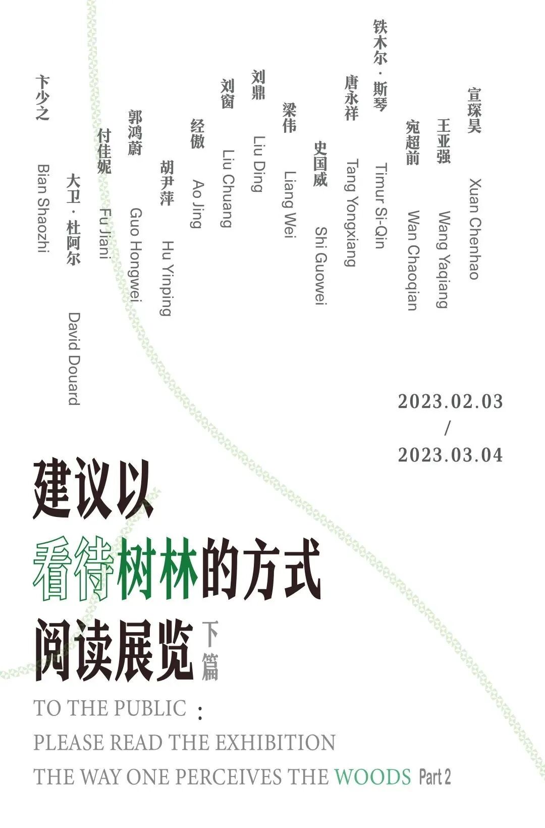 艺术家:卞少之、大卫·杜阿尔、付佳妮、郭鸿蔚、胡尹萍、经傲、刘窗、刘鼎、梁伟、史国威、唐永祥、铁木尔·斯琴、宛超前、王亚强、宣琛昊