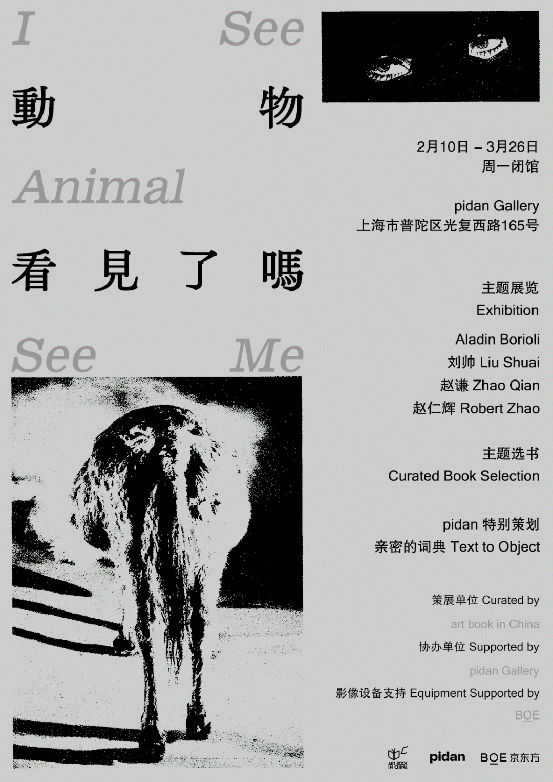 “动物看见了吗?” 是基于abC艺术书展“游牧与想象”主题所策划的特别主题展览,以4组艺术作品、20余本精选艺术出版物及pidan自主策划项目,注视动物之眼,观看动物行迹,亦接受动物似是而非的眼神回应。