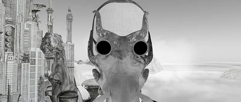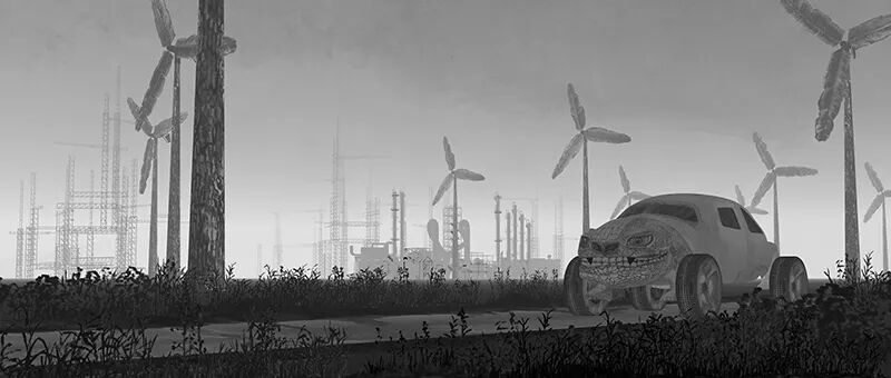 在《新山海经 三》中,我们的视野在一个基于现实虚构的世界里漫游,可以见到诸如对抗雾霾用的口罩,体验虚拟现实用的装备,以及与环境、城市改造、社会监控等问题相关的因今日的社会困境和科技发展而产生的工具和景观。但是这些工具和景观被改造为类似于赛博格一样与奇怪的生物结合的产物。就像《山海经》原著中对动物的描述,其中有符号化的隐喻,同时他们也被赋予了一种超自然的力量,而所有被赋予超自然力量的叙述都可以是神话的,无论是古代还是今天。《新山海经 三》中用一种神话的叙事描绘今天的世界,自然会把现代科技的产物,诸如汽车、飞机、生产工具进行神话的诠释。但反过来看,科技在今天,实际上本身是神话的“替代品”,它们是某种“魔力”或者超自然力量的投射物。在《新山海经 三》中有我对于神话和今日科技之间关系的思考:神话指向一个过去的时间,科幻则指向未来,但是他们的内核都有超自然力量的神话元素。