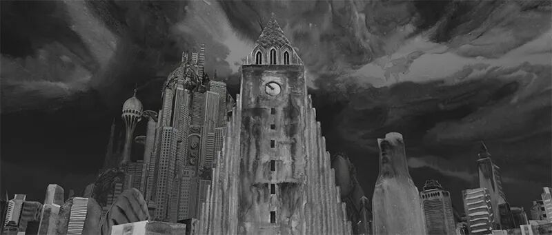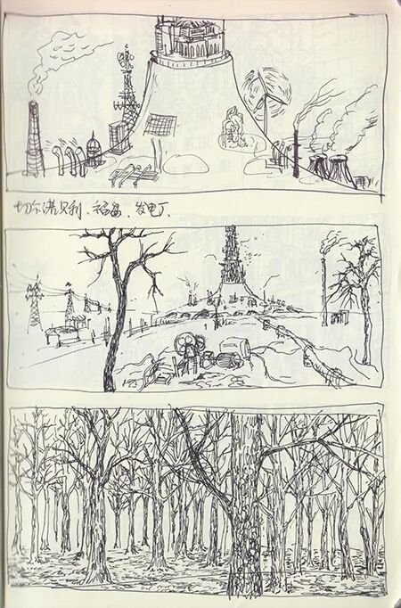 《新山海经 三》描绘的是一种末世般的未来:现实环境的急剧恶化,空旷无人的城市被动物和植物占领,面带章鱼面具的人从高楼坠落,监视器鸟监控着空无一人的街道,所有人沉醉于网络的虚拟现实,桃花源一般的自然传统也仅仅是虚拟的景观。作品描绘的场景如预言一般展示出疫情后的世界图景。